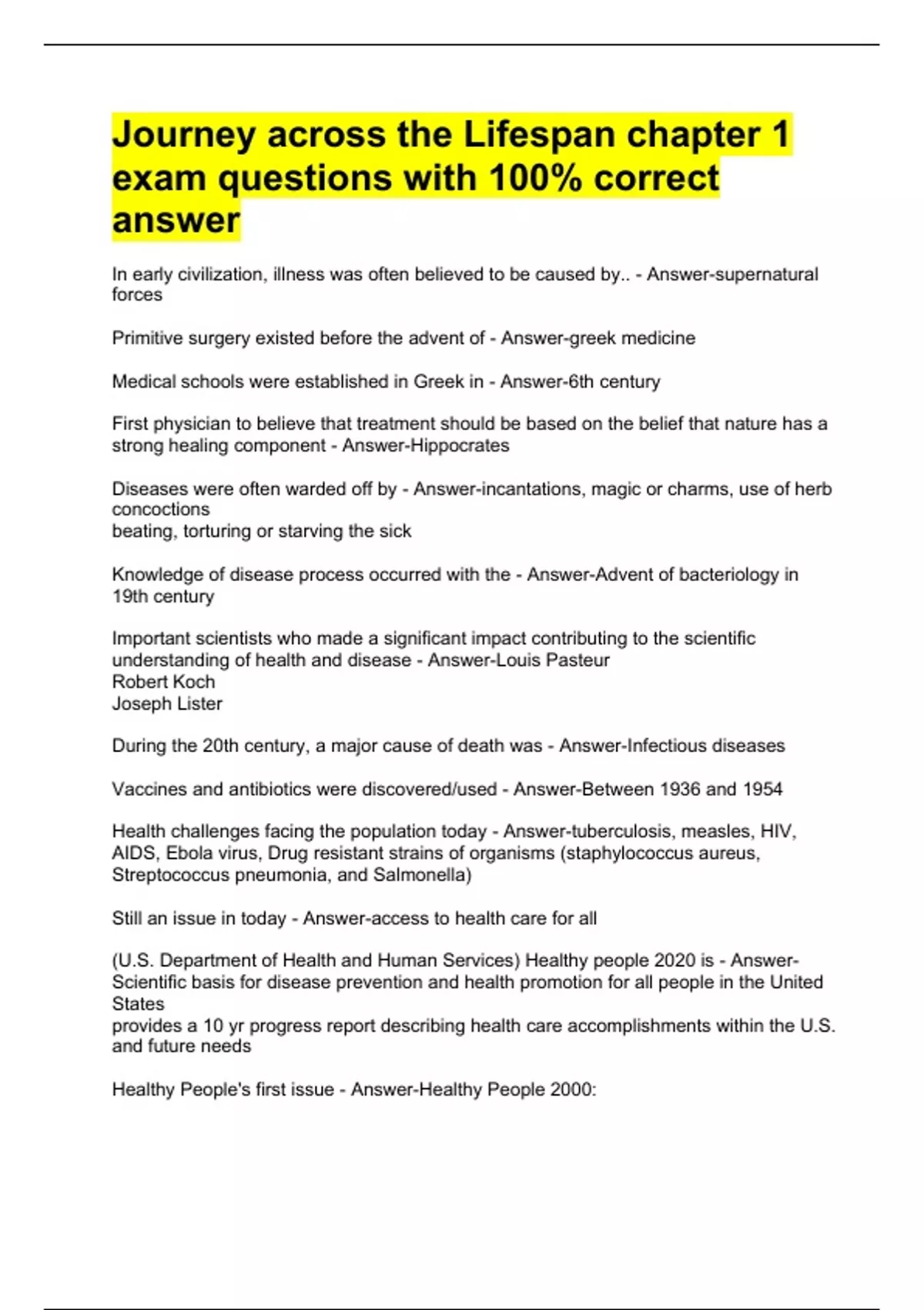 Journey across the Lifespan chapter 1 exam questions with 100% correct answer Diseases were often warded off by - Answer-incantations, magic or charms, use of herb concoctions beating, torturing or starving the sick Knowledge of disease process occurred with the - Answer-Advent of bacteriology in 19th century Important scientists who made a significant impact contributing to the scientific understanding of health and disease - Answer-Louis Pasteur Robert Koch Joseph Lister During the 20th century, a major cause of death was - Answer-Infectious diseases Vaccines and antibiotics were discovered/used - Answer-Between 1936 and 1954 Health challenges facing the population today - Answer-tuberculosis, measles, HIV, AIDS, Ebola virus, Drug resistant strains of organisms (staphylococcus aureus, Streptococcus pneumonia, and Salmonella) Still an issue in today - Answer-access to health care for all (U.S. Department of Health and Human Services) Healthy people 2020 is - Answer-Scientific basis for disease prevention and health promotion for all people in the United States provides a 10 yr progress report describing health care accomplishments within the U.S. and future needs