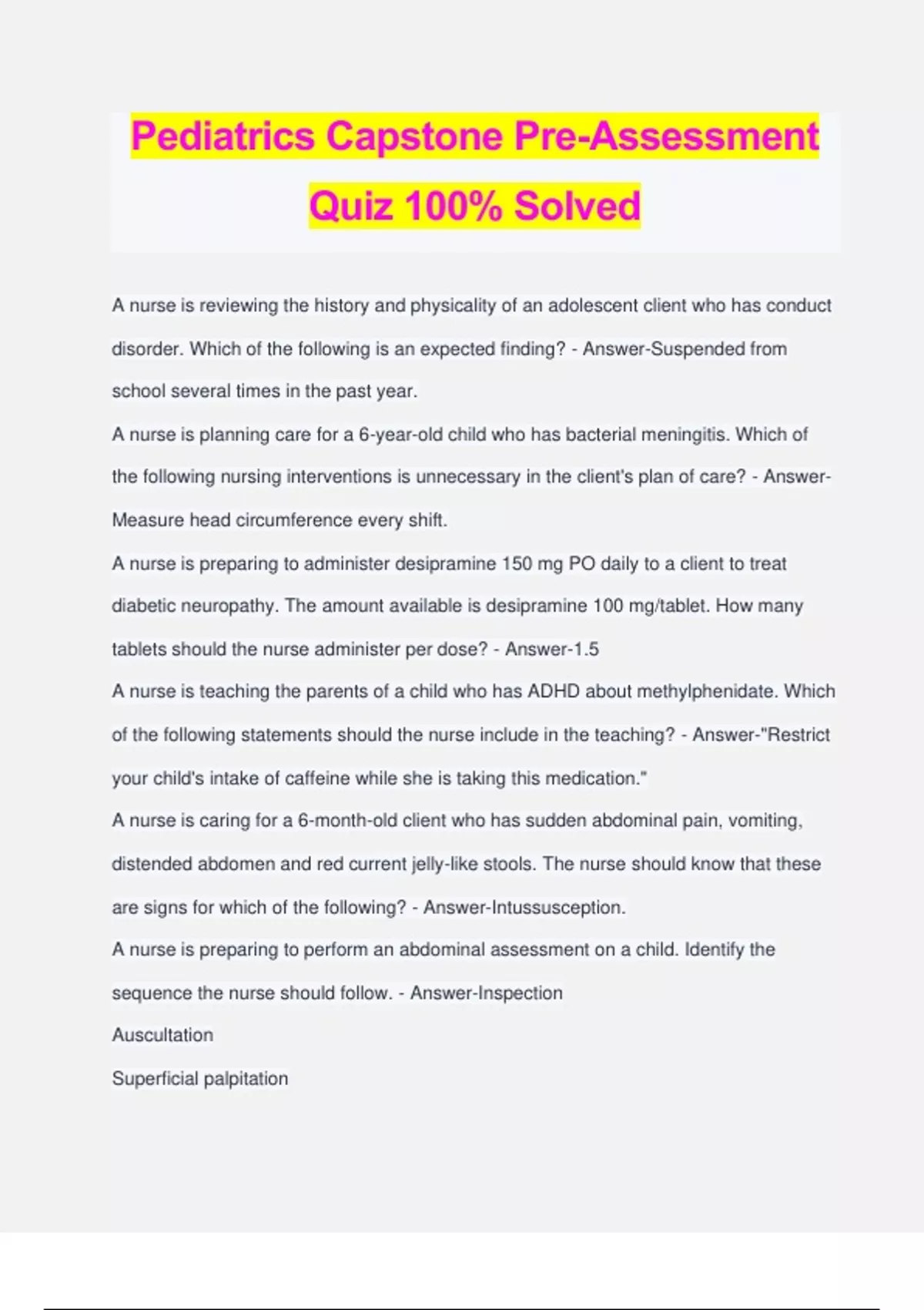 Measure head circumference every shift. A nurse is preparing to administer desipramine 150 mg PO daily to a client to treat diabetic neuropathy. The amount available is desipramine 100 mg/tablet. How many tablets should the nurse administer per dose? - Answer -1.5 A nurse is teaching the parents of a child who has ADHD about methylphenidate. Which of the following statements should the nurse include in the teaching? - Answer -"Restrict your child's intake of caffeine while she is taking this medication." A nurse is caring for a 6 -month -old client who has sudden abdominal pain, vomiting, distended abdomen and red current jelly -like stools. The nurse should know that these are signs for which of the following? - Answer -Intussusception. A nurse is preparing to perform an abdominal assessment on a child. Identify the sequence the nurse should follow. - Answer -Inspection Auscultation Superficial palpitation Deep palpitation A nurse is caring for a 4 -year-old child who has a new diagnosis of diabetes mellitus and is distressed after an insulin injection. Which of the following play activities should the nurse recognize is therapeutic in helping the child deal with the injectio n? - Answer -