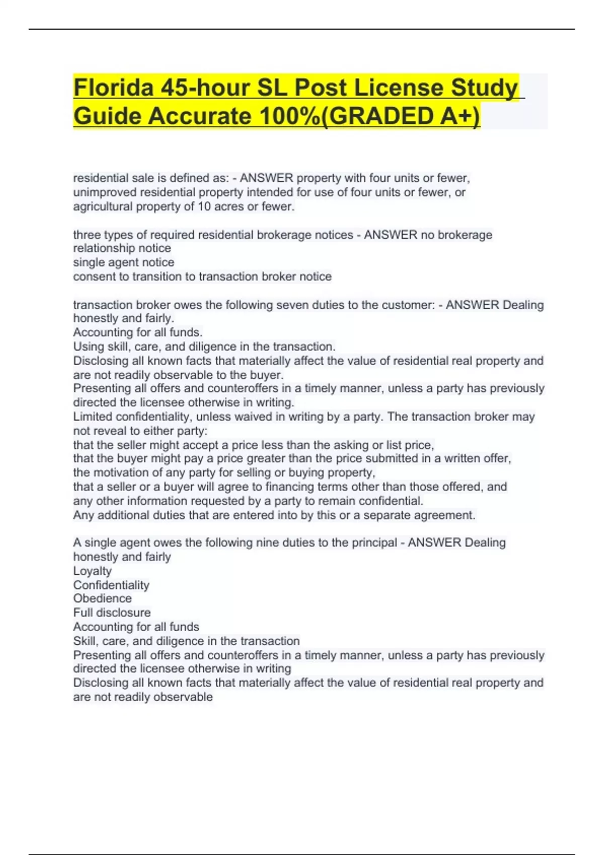 Florida 45-hour SL Post License Study Guide Accurate 100%(GRADED A+)