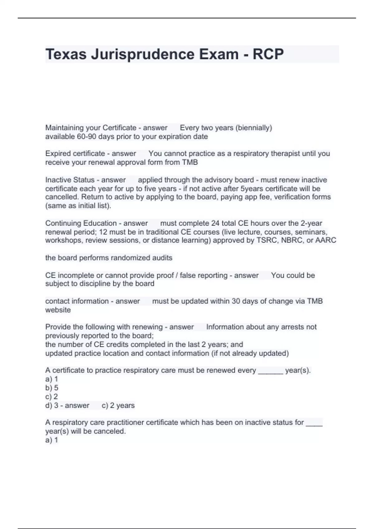 Texas Jurisprudence Exam - RCP Questions and Answers 2024