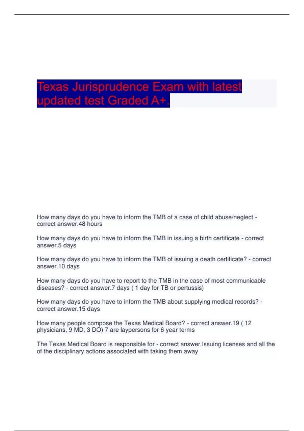 Texas Jurisprudence Exam with latest updated test Graded A+. How many days do you have to inform the TMB of a case of child abuse/neglect - correct answer.48 hours How many days do you have to inform the TMB in issuing a birth certificate - correct answer.5 days How many days do you have to inform the TMB of issuing a death certificate? - correct answer.10 days How many days do you have to report to the TMB in the case of most communicable diseases? - correct answer.7 days ( 1 day for TB or pertussis) How many days do you have to inform the TMB about supplying medical records? - correct answer.15 days How many people compose the Texas Medical Board? - correct answer.19 ( 12 physicians, 9 MD, 3 DO) 7 are laypersons for 6 year terms The Texas Medical Board is responsible for - correct answer.Issuing licenses and all the of the disciplinary actions associated with taking them away What is the Texas Medical Practice Act? - correct answer.Everything doctors must adhere to hen practicing medicine in Texas. And all laws only apply to Texas licensed physicians while practicing in Texas, or outsiders providing telemedicine services to patients in Texas What doctors are excluded from the Texas Medical Practice Act - correct answer.Podiatrists, dentists, optometrists, nurses, or medical students. Non-compensated emergency care is also exempt (covered by the Good Samaritan Law) What is the license criteria? - correct answer.Complete college (60 credits), have an MD or DO, Pass the USMLE steps 1-3 (within the past 7 yrs) and the JP exam, complete your intern year Any U.S. trained graduate finished with the steps an apply for a full Texas medical license after completing their - correct answer.Internship Corollary - correct answer.If you quit your residency after internship, you can still practice s a fully licensed physician in Texas (though not board certified in a specialty) Corollary 2 - correct answer.Naturopathic doctors, podiatrists, optometrists, chiropractors, dentists, are not licensed by the TMB and have their own governing bodies and rules 2 years - correct answer.After how many years do you renew your license? No fine - correct answer.What happens if you ware late by less than 30 days? What happens if your license is expired for more than 30 days? - correct answer.$75 fee What happens if your license expires after 365 days? - correct answer.$145 You must reapply and pay the fees again - correct answer.What happens if your license is expired for more than a year? You have to reapply for the license and retake the JP exam - correct answer.What happens if your license is expired for more than 2 years or longer?
