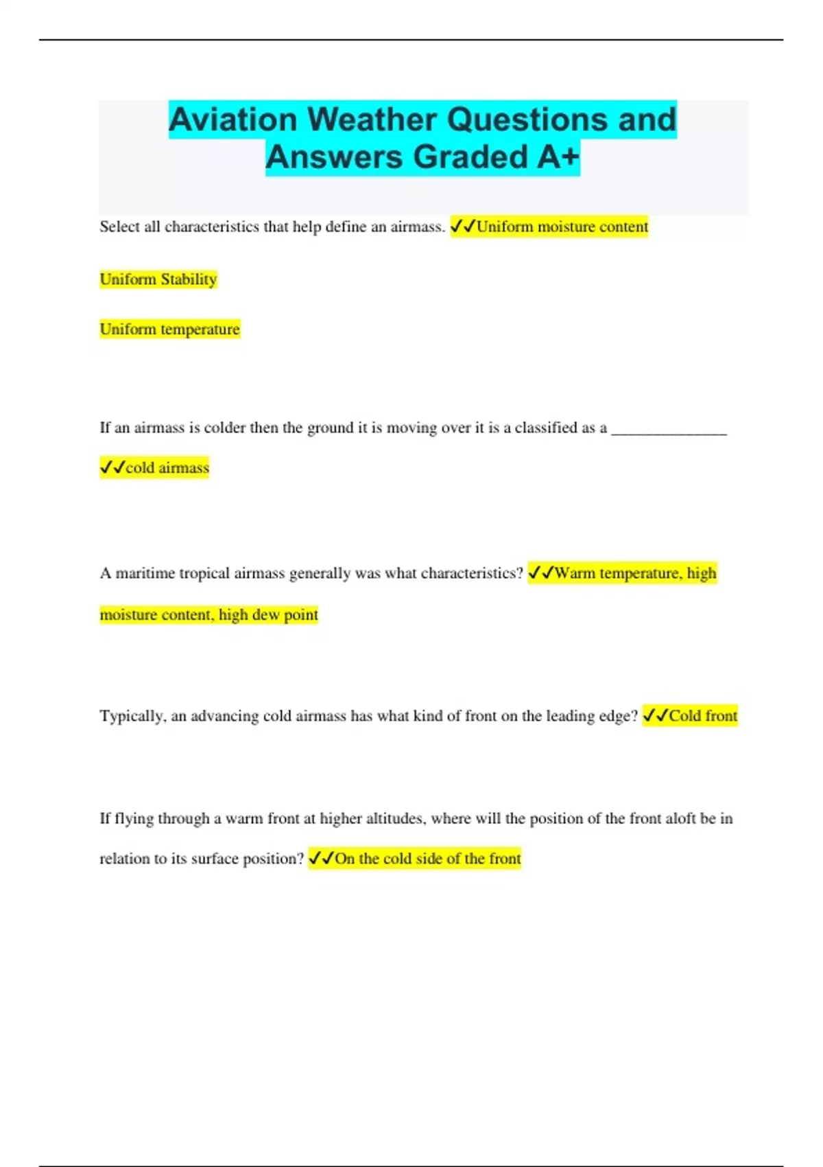 Aviation Weather Questions and Answers Graded A+ Select all characteristics that help define an airmass. Uniform moisture content Uniform Stability Uniform temperature If an airmass is colder then the ground it is moving over it is a classified as a ______________ cold airmass A maritime tropical airmass generally was what characteristics? Warm temperature, high moisture content, high dew point Typically, an advancing cold airmass has what kind of front on the leading edge? Cold front If flying through a warm front at higher altitudes, where will the position of the front aloft be in relation to its surface position? On the cold side of the front Select the 3 conditions that will always change when passing through a front regardless of the type of front. A change in pressure A change in wind direction or velocity A change in temperature While flying a cross country what type of wind conditions might indicate that you are flying towards worsening weather? Continuous left cross wind What what maximum sustained wind speed can a tropical storm be reclassified as a hurricane? 64 or more knots A stable airmass typically presents what characteristics? Poor visibility, not turbulent Which term refers to a circulation with horizontal dimensions of 1 to 1,000 nautical miles? Mesoscale What is not an example of of mesoscale circulation? Jetstream Where is the Hadley circulation cell located? From the equator to 30° latitude. Where are the prevailing westerlies located? Between 30°N and 60°N latitude. What causes the formation of the polar front? The converging surface winds bringing warm air and cold air masses together. What causes the summer monsoon circulation? The lower pressure over the land due to the warmer temps causing a flow of air inward to the land from the ocean. What causes the low precipitation and suppression in cloud formation along the horse latitudes? High pressure caused by diverging surface winds. What is the term that describes smaller scale circulations occuring within larger scale circulations? Embedded circulations