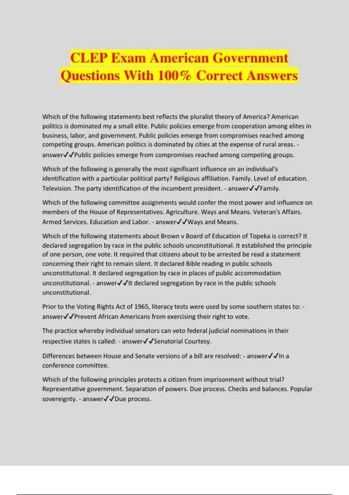 CLEP Exam American Government Questions With 100% Correct Answers Which of the following statements best reflects the pluralist theory of America? American politics is dominated my a small elite. Public policies emerge from cooperation among elites in business, labor, and government. Public policies emerge from compromises reached among competing groups. American politics is dominated by cities at the expense of rural areas. - answerPublic policies emerge from compromises reached among competing groups. Which of the following is generally the most significant influence on an individual's identification with a particular political party? Religious affiliation. Family. Level of education. Television. The party identification of the incumbent president. - answerFamily. Which of the following committee assignments would confer the most power and influence on members of the House of Representatives. Agriculture. Ways and Means. Veteran's Affairs. Armed Services. Education and Labor. - answerWays and Means. Which of the following statements about Brown v Board of Education of Topeka is correct? It declared segregation by race in the public schools unconstitutional. It established the principle of one person, one vote. It required that citizens about to be arrested be read a statement concerning their right to remain silent. It declared Bible reading in public schools unconstitutional. It declared segregation by race in places of public accommodation unconstitutional. - answerIt declared segregation by race in the public schools unconstitutional. Prior to the Voting Rights Act of 1965, literacy tests were used by some southern states to: - answerPrevent African Americans from exercising their right to vote. The practice whereby individual senators can veto federal judicial nominations in their respective states is called: - answerSenatorial Courtesy. Differences between House and Senate versions of a bill are resolved: - answerIn a conference committee. Which of the following principles protects a citizen from imprisonment without trial? Representative government. Separation of powers. Due process. Checks and balances. Popular sovereignty. - answerDue process. The passage of legislation in Congress often depends on mutual accomodations among members. This suggests that, to some extent, congressional behavior is based on: - answerThe principle of reciprocity. Which of the following statements accurately describes the president's veto power? A president sometimes threatens to veto a bill that is under discussion in order to influence congressional decision making. A president typically vetoes about a third of the bills passed by Congress. Congress is usually unable to override a president's veto. - answerA president sometimes threatens to veto a bill that is under discussion in order to influence congressional decision makin. Congress is usually unable to override a president's veto. All of the following issues were decided at the Constitutional Convention of 1787 EXCEPT: Representation in the legislature. Voting qualifications of the electorate. The method of electing the president. Congressional power to override a presidential veto. Qualifications for members of the house and Senate. - answerVoting qualifications of the electorate. The principle of stare decisis refers to which of the following? The process in which groups write leal briefs to influence the outcome of a case. The process by which Supreme Court justices decide which cases to hear. The process by which judges interpret common law principles along with constitutional law. The judicial principle of following precedents that were established in previous court decisions. A legal principle that allows parties to settle their disputes outside the courtroom. - answerThe judicial principle of following precedents that were established in previous court decisions. The usefulness to the president of having cabinet members as political advisors is undermined by the fact that: - answerThe loyalties of cabinet members are often divided between loyalty to the president or loyalty to their own executive departments. All of the following are constitutional rights that neither the federal government nor the states can restrict EXCEPT the right to: Remain silent during questioning. Be represented by counsel. Be indicted by grand jury. Not be tried for the same offense twice. Receive a trial by jury in a criminal case. - answerBe indicted by grand jury. In the electoral history o the United States, third parties have been effective vehicles of protest when they: - answerDramatized issues and positions that were being ignored by the major parties. Which of the following best defines the term "judicial activism"? The tendency of judges to hear large numbers of cases on social issues. The efforts of judges to lobby Congress for funds. The unwillingness of judges to remove themselves from cases in which they have a personal interest. The attempts by judges to influence elective outcomes. The attempts by judges to influence public policy through their case decisions. - answerThe attempts by judges to influence public policy through their case de