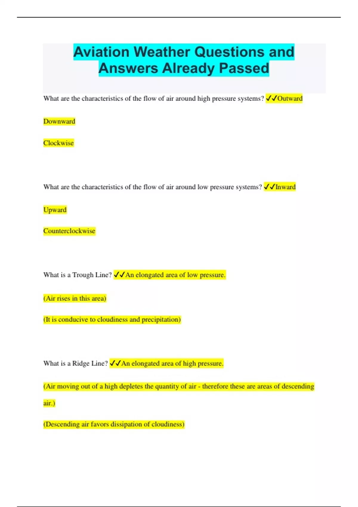 Aviation Weather Questions and Answers Already Passed What are the characteristics of the flow of air around high pressure systems? Outward Downward Clockwise What are the characteristics of the flow of air around low pressure systems? Inward Upward Counterclockwise What is a Trough Line? An elongated area of low pressure. (Air rises in this area) (It is conducive to cloudiness and precipitation) What is a Ridge Line? An elongated area of high pressure. (Air moving out of a high depletes the quantity of air - therefore these are areas of descending air.) (Descending air favors dissipation of cloudiness) What are isobars? Lines on a weather chart which connect areas of equal or constant barometric pressure. If isobars are close together on a weather chart or a constant pressure chart what does this mean? This shows the steepness of the pressure gradient. • Close = Steep Pressure Gradient = High Wind Speeds • Spaced Out = Shallow PG = Low Wind Speeds What causes the winds aloft to flow parallel to the isobars? Coriolis Force What causes surface winds to generally flow across the isobars at an angle? Surface Friction What is the effect of stable air on clouds? Stratiform What is the effect of unstable air on clouds? Cumuliform What is the effect of stable air on turbulence? Smooth What is the effect of unstable air on turbulence? Rough What is the effect of stable air on precipitation?