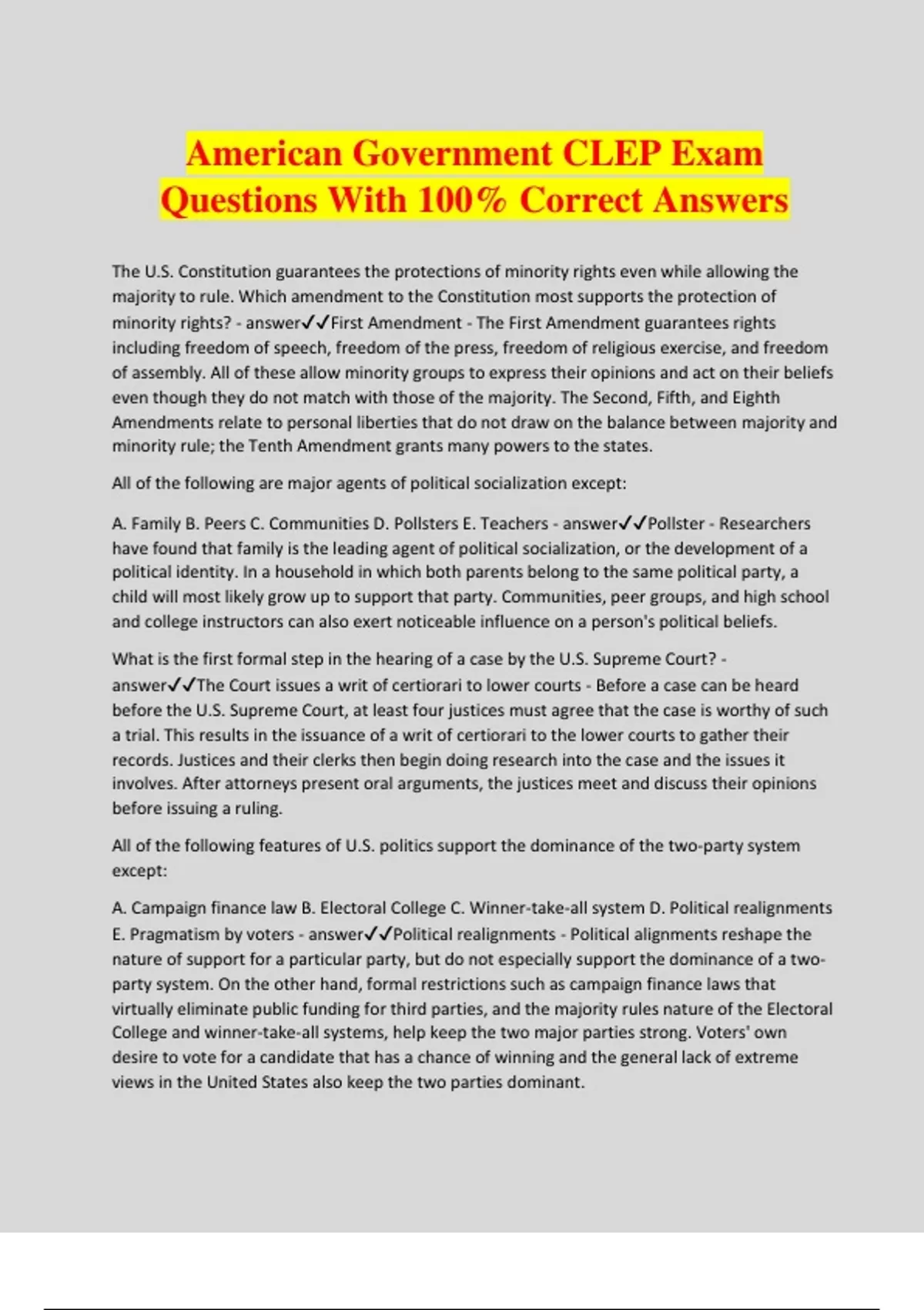 American Government CLEP Exam Questions With 100% Correct Answers The U.S. Constitution guarantees the protections of minority rights even while allowing the majority to rule. Which amendment to the Constitution most supports the protection of minority rights? - answerFirst Amendment - The First Amendment guarantees rights including freedom of speech, freedom of the press, freedom of religious exercise, and freedom of assembly. All of these allow minority groups to express their opinions and act on their beliefs even though they do not match with those of the majority. The Second, Fifth, and Eighth Amendments relate to personal liberties that do not draw on the balance between majority and minority rule; the Tenth Amendment grants many powers to the states. All of the following are major agents of political socialization except: A. Family B. Peers C. Communities D. Pollsters E. Teachers - answerPollster - Researchers have found that family is the leading agent of political socialization, or the development of a political identity. In a household in which both parents belong to the same political party, a child will most likely grow up to support that party. Communities, peer groups, and high school and college instructors can also exert noticeable influence on a person's political beliefs. What is the first formal step in the hearing of a case by the U.S. Supreme Court? - answerThe Court issues a writ of certiorari to lower courts - Before a case can be heard before the U.S. Supreme Court, at least four justices must agree that the case is worthy of such a trial. This results in the issuance of a writ of certiorari to the lower courts to gather their records. Justices and their clerks then begin doing research into the case and the issues it involves. After attorneys present oral arguments, the justices meet and discuss their opinions before issuing a ruling. All of the following features of U.S. politics support the dominance of the two-party system except: A. Campaign finance law B. Electoral College C. Winner-take-all system D. Political realignments E. Pragmatism by voters - answerPolitical realignments - Political alignments reshape the nature of support for a particular party, but do not especially support the dominance of a two- party system. On the other hand, formal restrictions such as campaign finance laws that virtually eliminate public funding for third parties, and the majority rules nature of the Electoral College and winner-take-all systems, help keep the two major parties strong. Voters' own desire to vote for a candidate that has a chance of winning and the general lack of extreme views in the United States also keep the two parties dominant. Which two political parties were the first to emerge in the United States? - answerDemocratic Republicans and Federalists - Although the U.S. Constitution says nothing about the use of political parties, the earliest parties had begun to emerge even during the presidency of George Washington. Led by Alexander Hamilton, the Federalists supported the power of a strong central government. In contrast, the Democratic Republicans, led by Thomas Jefferson, preferred to assign power to the states. This struggle between national and state authority has long influenced the U.S. political discussion. The purpose of the filibuster is to - answerdelay or prevent the passage of laws - One way that senators can prevent the passage of a bill they oppose is to keep talking until the time allotted to debate the bill has passed. This process is called the filibuster. Because the House has set time limits for each member to speak without further approval, the filibuster functions only in the Senate. Its use dates back to 1790, and although it sometimes draws criticism from members of the majority party, has been used through U.S. history. "The House of Representatives shall choose their Speaker and other Officers; and shall have the sole Power of Impeachment." - answerChecks and balances - This section of the U.S. Constitution grants the House of Representatives, one of the two bodies within the U.S. Congress, the right to select their leader and the right to begin impeachment proceedings. Impeachment is one of the leading checks that the House has on the power of the president, and thus closely relates to the fundamental idea of checks and balances within U.S. government. Although the selection of a Speaker draws on the idea of direct democracy, the United States is not founded on this belief. Which Supreme Court case created the "clear and present danger" rule to test the limits of free speech? - answerSchenck v. United States - The World War I-era ruling in Schenck v. United States stated that constitutional right to free speech did not extend to those statements that presented a "clear and present danger" to national security. In this instance, the defendant's conviction for distributing literature against the draft during wartime was allowed to stand. The other rulings do not relate to the issue of freedom of speech and national security. Which of the following is NOT a power granted to Congress? A. Levy taxes B. Declare war C. Establish courts D. Suspend habeas corpus E. Govern the federal district - answerSuspend habeas corpus - The U.S. Constitution grants many powers to Congress, including the rights to levy taxes, declare war, establish a system of federal courts, and oversee the federal district, Washington, DC. However, the Constitution specifically bars Congress from some actions. Among these is a denial of the right to suspend habeas corpus— the right of a prisoner to be charged with a crime before a judge without indefinite detainment. This may be done during times of war or revolt, and in fact was carried out during the Civil War. Which term best describes a polling distribution in which a graph of responses resembles a bell curve? - answerNormal distribution - A normal distribution most closely resembles a bell curve, with many res
