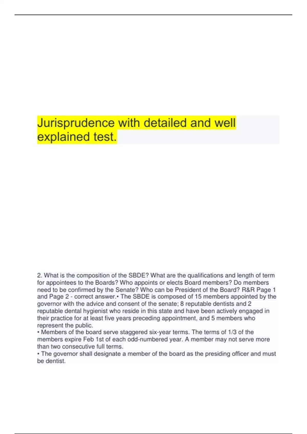 Jurisprudence with detailed and well explained test. 2. What is the composition of the SBDE? What are the qualifications and length of term for appointees to the Boards? Who appoints or elects Board members? Do members need to be confirmed by the Senate? Who can be President of the Board? R&R Page 1 and Page 2 - correct answer.• The SBDE is composed of 15 members appointed by the governor with the advice and consent of the senate; 8 reputable dentists and 2 reputable dental hygienist who reside in this state and have been actively engaged in their practice for at least five years preceding appointment, and 5 members who represent the public. • Members of the board serve staggered six-year terms. The terms of 1/3 of the members expire Feb 1st of each odd-numbered year. A member may not serve more than two consecutive full terms. • The governor shall designate a member of the board as the presiding officer and must be dentist. 4. How many hours of CE must a dentist and a dental hygienist have each year in order to maintain one's license? How many hours per year can be self-study or correspondence? What types of courses are required to be taken? Is it necessary to submit documented evidence of the specified hours of CE when renewing your annual registration for re-licensure? R&R Page 20, 21 and 23 - correct answer.• 12 hours • Up to 6 hours can be self-study. • Courses must be either scientific or technical as related to clinical care. • No, unless specially asked to do so. 5. What criteria are used to grant a dental or dental hygiene license by credentials? Must dental and dental hygiene educators in Texas have a license? R&R Page 16, 17 and 18 - correct answer.• At least 18 of good moral character and professional fitness, which is demonstrated by patterns of personal academic and occupational behaviors. . . graduated from high school or has GED, graduated from a dental school accredited by the commission on dental accreditation of the American dental association (CODA), taken and passed all exams, paid all fees successfully completed BLS training submitted finger prints 6. What are the duties that a dentist may NOT delegate to a dental hygienist? to a dental assistant? What duties may be delegated? R&R Page 99-100 and 87-93 - correct answer.• Assistant can't: remove calculus/deposits from natural of restored surfaces in the mouth, root planing or smoothing and polishing of a roughened root surface • Assistant can: place sealants (if certified), apply varnish, obtain radiographs (if certified), and coronal polishing (if certified) • Dental Hygienist can't: perform examination, diagnose, surgically cut hard or soft tissue, take an impression for a final restoration/appliance, perform an occlusal adjustment, perform an endo procedure, perform any irreversible procedure • Dental Hygienist can: Monitor Nitrous oxide (if certified), perform any reversible procedure delegate by dentist 7. If a dentist or dental hygienist allows their license to expire, what must they do to get it back? (DPA Page 65) - correct answer.• A person whose license has expired for 90 days or less may renew the license by paying to the board a renewal fee that is equal to 1-1/2 times the normally required renewal fee • A person whose license has been expired for more than 90 days but less than one year may renew the license by paying to the board a renewal fee that is equal to two times the normally required renewal fee • A person whose license has been expired for one year or more may not renew the license. The person may obtain a new license by complying with the requirements and procedures, including the examination requirements for obtaining an original license 14.What are the requirements for notifying the board of change of home address or office location or employer? (R&R Page 55) - correct answer.• Must notify the board within 60 days of the change being made. 17. With whom are complaints against a dentist or dental hygienist files? (DPA Page 39) - correct answer.• State Board of Dental Examiners, Enforcement Division, the Director • Complaints concerning dental services can be directed to the board by providing name, mailing address, and telephone numbers of the board. You can put info on a sign prominently displayed in the business. Requirements are o Lettering size shall be a minimum of 10 point font. o Lettering shall be in black or blue-black ink o All lettering shall be legible o Signs not obtained from the board shall be a minimum of 5x7 inches