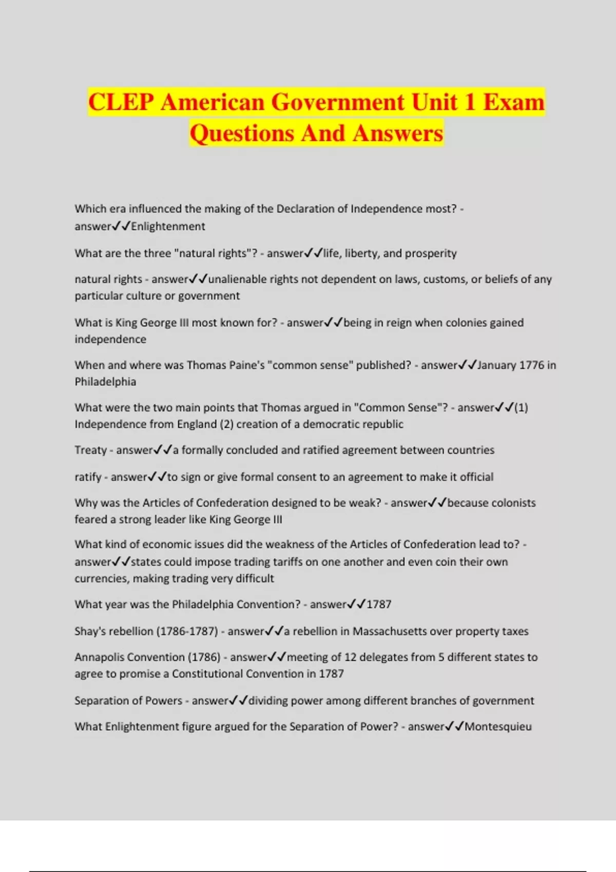 CLEP American Government Unit 1 Exam Questions And Answers Which era influenced the making of the Declaration of Independence most? - answerEnlightenment What are the three "natural rights"? - answerlife, liberty, and prosperity natural rights - answerunalienable rights not dependent on laws, customs, or beliefs of any particular culture or government What is King George III most known for? - answerbeing in reign when colonies gained independence When and where was Thomas Paine's "common sense" published? - answerJanuary 1776 in Philadelphia What were the two main points that Thomas argued in "Common Sense"? - answer(1) Independence from England (2) creation of a democratic republic Treaty - answera formally concluded and ratified agreement between countries ratify - answerto sign or give formal consent to an agreement to make it official Why was the Articles of Confederation designed to be weak? - answerbecause colonists feared a strong leader like King George III What kind of economic issues did the weakness of the Articles of Confederation lead to? - answerstates could impose trading tariffs on one another and even coin their own currencies, making trading very difficult What year was the Philadelphia Convention? - answer1787 Shay's rebellion () - answera rebellion in Massachusetts over property taxes Annapolis Convention (1786) - answermeeting of 12 delegates from 5 different states to agree to promise a Constitutional Convention in 1787 Separation of Powers - answerdividing power among different branches of government What Enlightenment figure argued for the Separation of Power? - answerMontesqui
