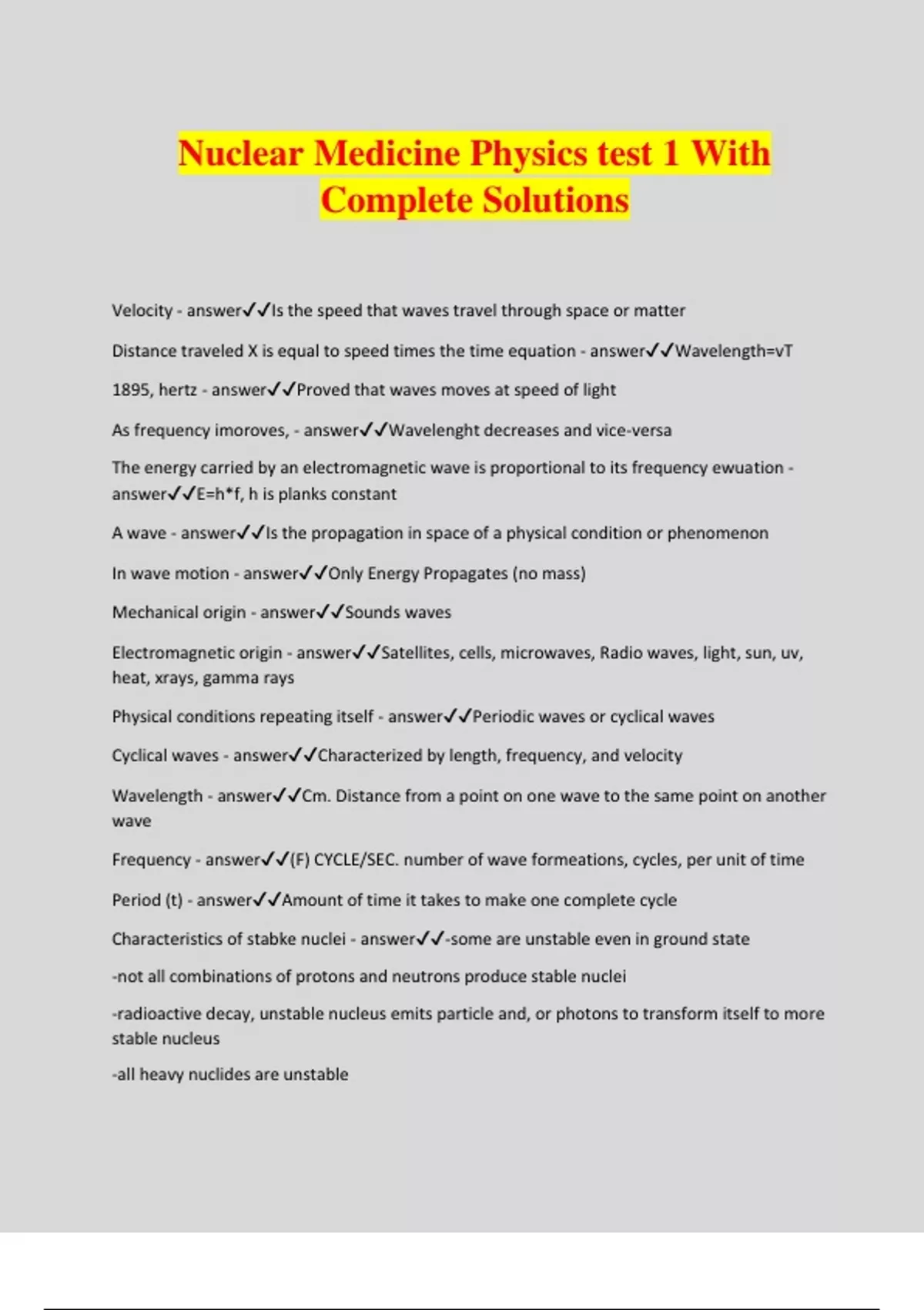 Nuclear Medicine Physics test 1 With Complete Solutions Velocity - answerIs the speed that waves travel through space or matter Distance traveled X is equal to speed times the time equation - answerWavelength=vT 1895, hertz - answerProved that waves moves at speed of light As frequency imoroves, - answerWavelenght decreases and vice-versa The energy carried by an electromagnetic wave is proportional to its frequency ewuation - answerE=h*f, h is planks constant A wave - answerIs the propagation in space of a physical condition or phenomenon In wave motion - answerOnly Energy Propagates (no mass) Mechanical origin - answerSounds waves Electromagnetic origin - answerSatellites, cells, microwaves, Radio waves, light, sun, uv, heat, xrays, gamma rays Physical conditions repeating itself - answerPeriodic waves or cyclical waves Cyclical waves - answerCharacterized by length, frequency, and velocity Wavelength - answerCm. Distance from a point on one wave to the same point on another wave Frequency - answer(F) CYCLE/SEC. number of wave formeations, cycles, per unit of time Period (t) - answerAmount of time it takes to make one complete cycle Characteristics of stabke nuclei - answer-some are unstable even in ground state -not all combinations of protons and neutrons produce stable nuclei -radioactive decay, unstable nucleus emits particle and, or photons to transform itself to more stable nucleus -all heavy nuclides are unstabl
