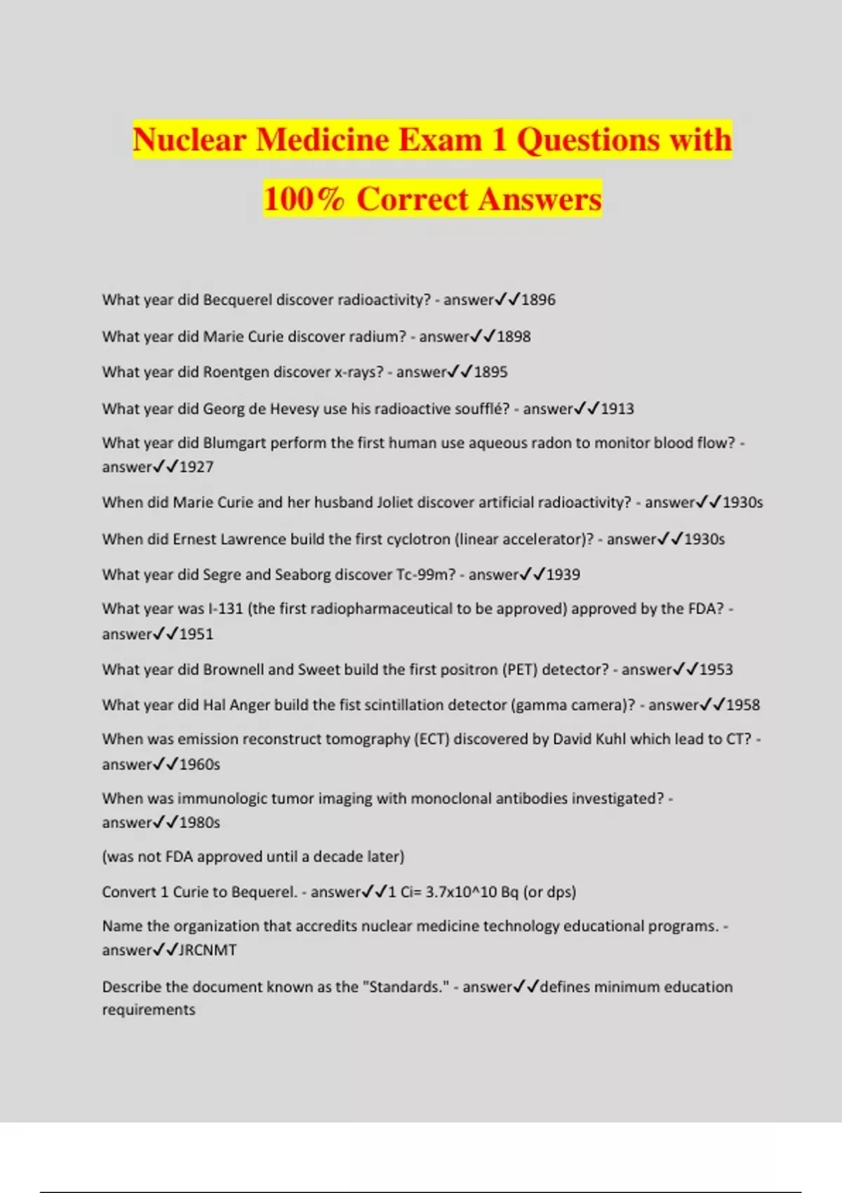 Nuclear Medicine Exam 1 Questions with 100% Correct Answers What year did Becquerel discover radioactivity? - answer1896 What year did Marie Curie discover radium? - answer1898 What year did Roentgen discover x-rays? - answer1895 What year did Georg de Hevesy use his radioactive soufflé? - answer1913 What year did Blumgart perform the first human use aqueous radon to monitor blood flow? - answer1927 When did Marie Curie and her husband Joliet discover artificial radioactivity? - answer1930s When did Ernest Lawrence build the first cyclotron (linear accelerator)? - answer1930s What year did Segre and Seaborg discover Tc-99m? - answer1939 What year was I-131 (the first radiopharmaceutical to be approved) approved by the FDA? - answer1951 What year did Brownell and Sweet build the first positron (PET) detector? - answer1953 What year did Hal Anger build the fist scintillation detector (gamma camera)? - answer1958 When was emission reconstruct tomography (ECT) discovered by David Kuhl which lead to CT? - answer1960s When was immunologic tumor imaging with monoclonal antibodies investigated? - answer1980s (was not FDA approved until a decade later) Convert 1 Curie to Bequerel. - answer1 Ci= 3.7x10^10 Bq (or dps) Name the organization that accredits nuclear medicine technology educational programs. - answerJRCNMT Describe the document known as the "Standards." - answerdefines minimum education requirement