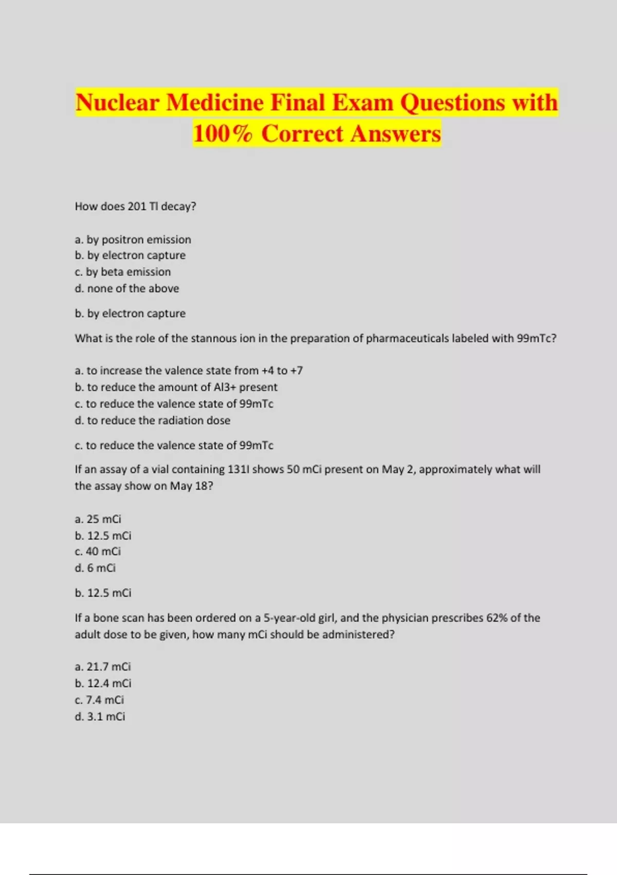 Nuclear Medicine Final Exam Questions with 100% Correct Answers How does 201 Tl decay? a. by positron emission b. by electron capture c. by beta emission d. none of the above b. by electron capture What is the role of the stannous ion in the preparation of pharmaceuticals labeled with 99mTc? a. to increase the valence state from +4 to +7 b. to reduce the amount of Al3+ present c. to reduce the valence state of 99mTc d. to reduce the radiation dose c. to reduce the valence state of 99mTc If an assay of a vial containing 131I shows 50 mCi present on May 2, approximately what will the assay show on May 18? a. 25 mCi b. 12.5 mCi c. 40 mCi d. 6 mCi b. 12.5 mCi If a bone scan has been ordered on a 5-year-old girl, and the physician prescribes 62% of the adult dose to be given, how many mCi should be administered? a. 21.7 mCi b. 12.4 mCi c. 7.4 mCi d. 3.1 mCi b. 12.4 mCi If the biological half-life of an isotope is 6 hours, and the physical half-life is 12 hrs, what is the effective half-life? a. 6 hrs b. 12 hrs c. 2 hrs d. 4 hrs d. 4 hrs Which of the following has been used to abbreviate physical half-life? a. Tp b. T/2 c. T2 d. P 1 /2 a. Tp The physical half life of a radionuclide is the time it takes: a. for half of the substance to leave the body b. for the nuclide to decay to one half of the original activity c. for the kit to become half expired d. for half of the substance to be metabolized b. for the nuclide to decay to one half of the original activity If a kit has 310 mCi of activity present at 8:00 a.m., what will the vial assay show in 4 hours and 10 minutes if the decay factor is 0.618? a. 175 mCi b. 192 mCi c. 501 mCi d. 155 mCi b. 192 mCi A vial containing 99mTc is a