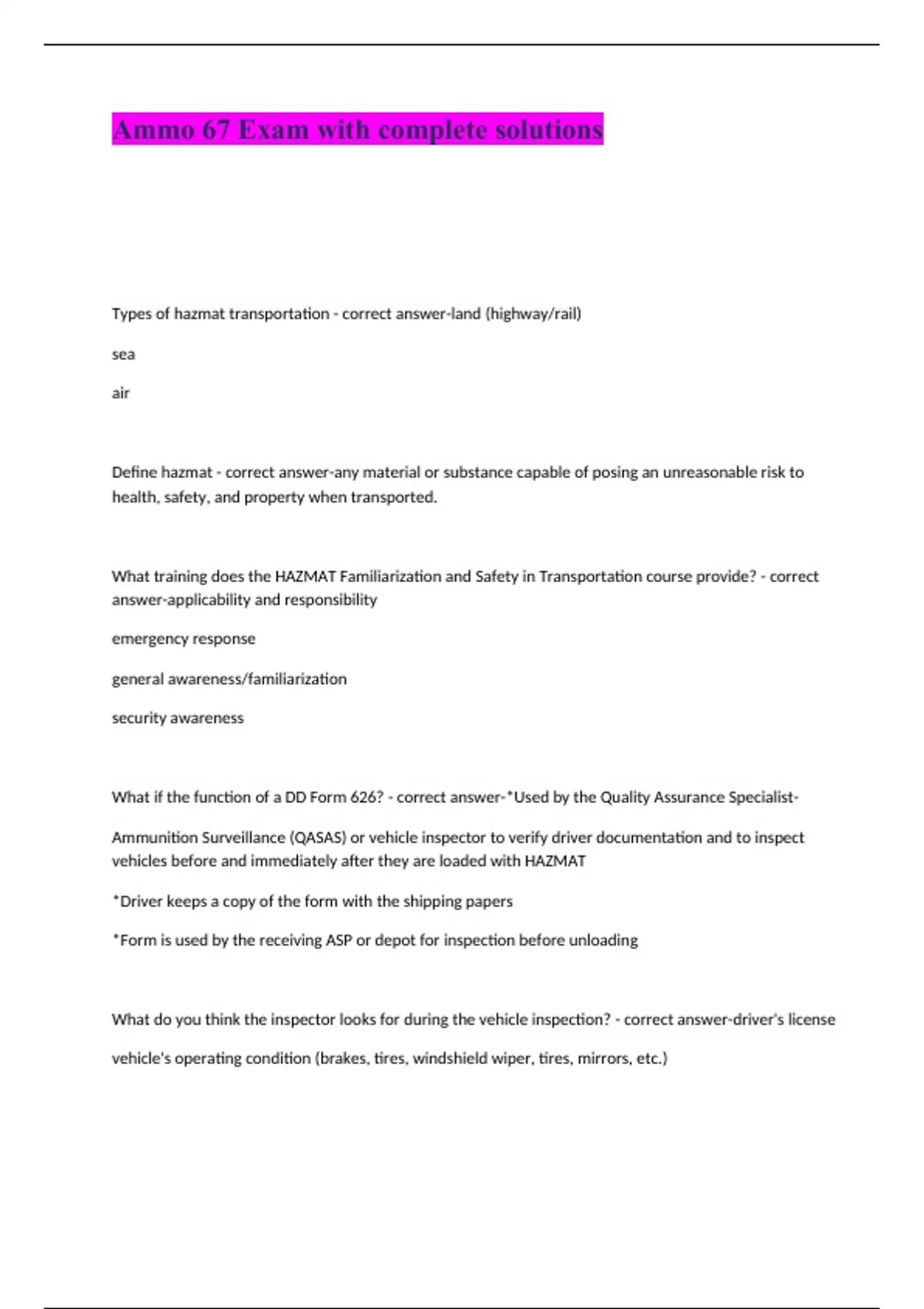 Types of hazmat transportation - correct answer-land (highway/rail) sea air Define hazmat - correct answer-any material or substance capable of posing an unreasonable risk to health, safety, and property when transported. What training does the HAZMAT Familiarization and Safety in Transportation course provide? - correct answer-applicability and responsibility emergency response general awareness/familiarization security awareness What if the function of a DD Form 626? - correct answer-*Used by the Quality Assurance Specialist- Ammunition Surveillance (QASAS) or vehicle inspector to verify driver documentation and to inspect vehicles before and immediately after they are loaded with HAZMAT *Driver keeps a copy of the form with the shipping papers *Form is used by the receiving ASP or depot for inspection before unloading What do you think the inspector looks for during the vehicle inspection? - correct answer-driver's license vehicle's operating condition (brakes, tires, windshield wiper, tires, mirrors, etc.)