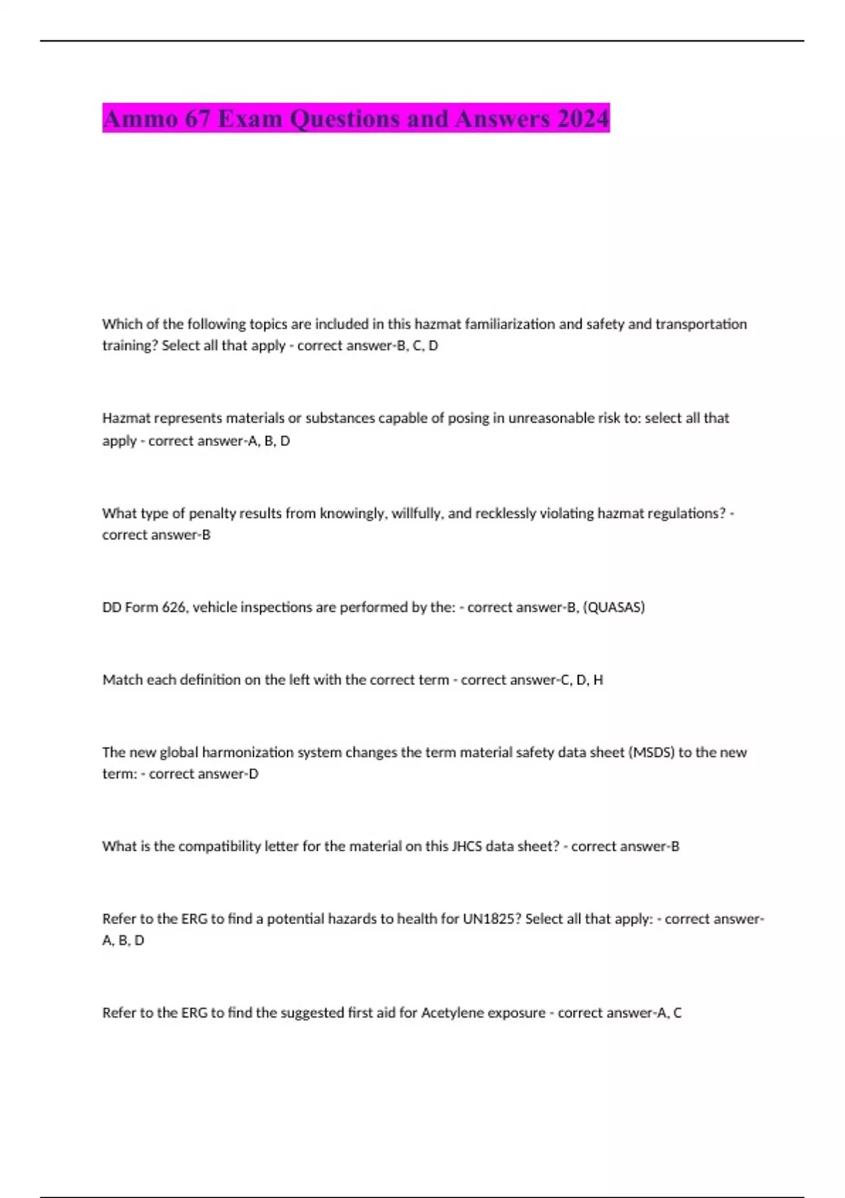 Which of the following topics are included in this hazmat familiarization and safety and transportation training? Select all that apply - correct answer-B, C, D Hazmat represents materials or substances capable of posing in unreasonable risk to: select all that apply - correct answer-A, B, D What type of penalty results from knowingly, willfully, and recklessly violating hazmat regulations? - correct answer-B DD Form 626, vehicle inspections are performed by the: - correct answer-B, (QUASAS) Match each definition on the left with the correct term - correct answer-C, D, H The new global harmonization system changes the term material safety data sheet (MSDS) to the new term: - correct answer-D What is the compatibility letter for the material on this JHCS data sheet? - correct answer-B Refer to the ERG to find a potential hazards to health for UN1825? Select all that apply: - correct answer-A, B, D Refer to the ERG to find the suggested first aid for Acetylene exposure - correct answer-A, C