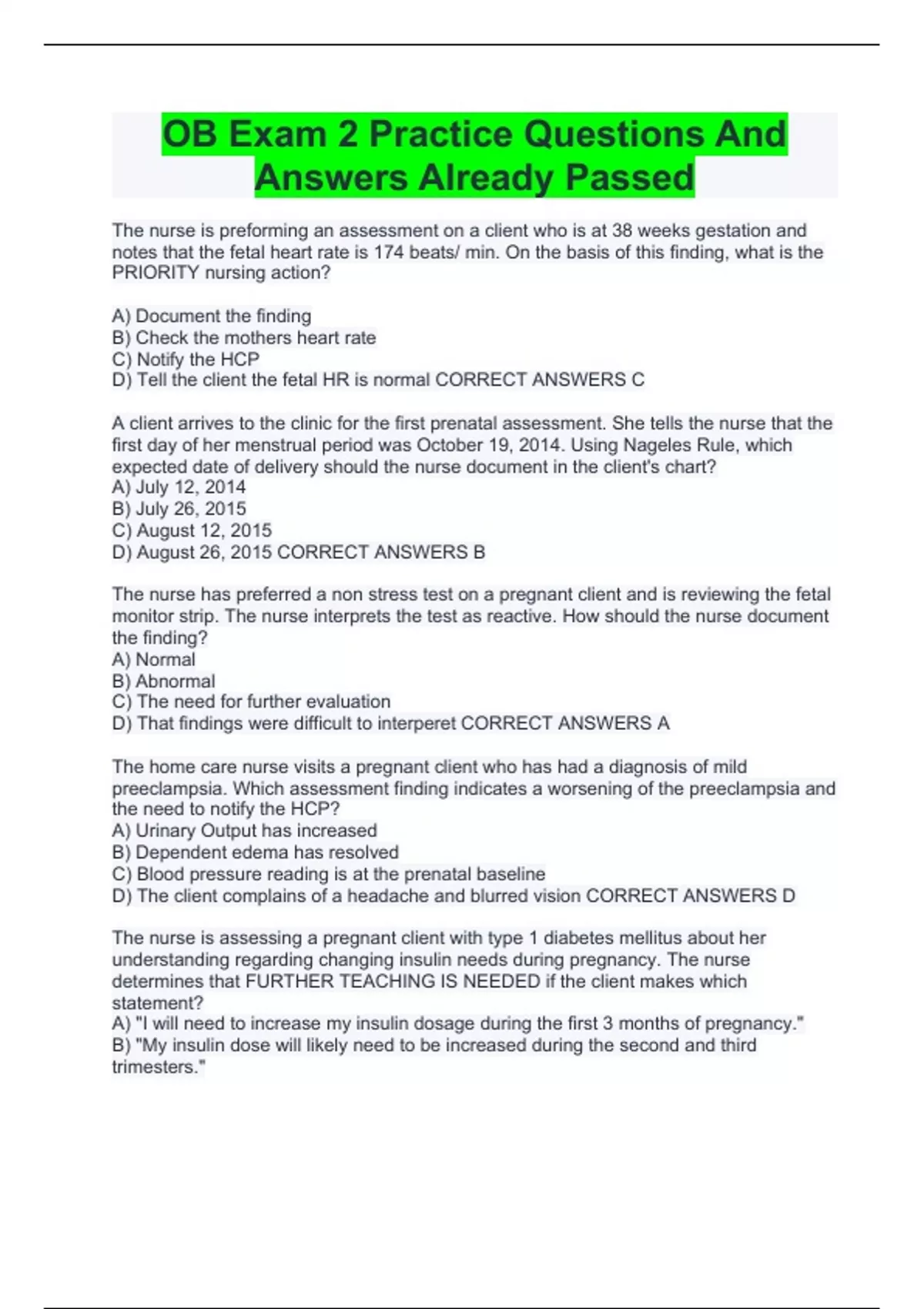 ob exam 2 practice questions and answers already p