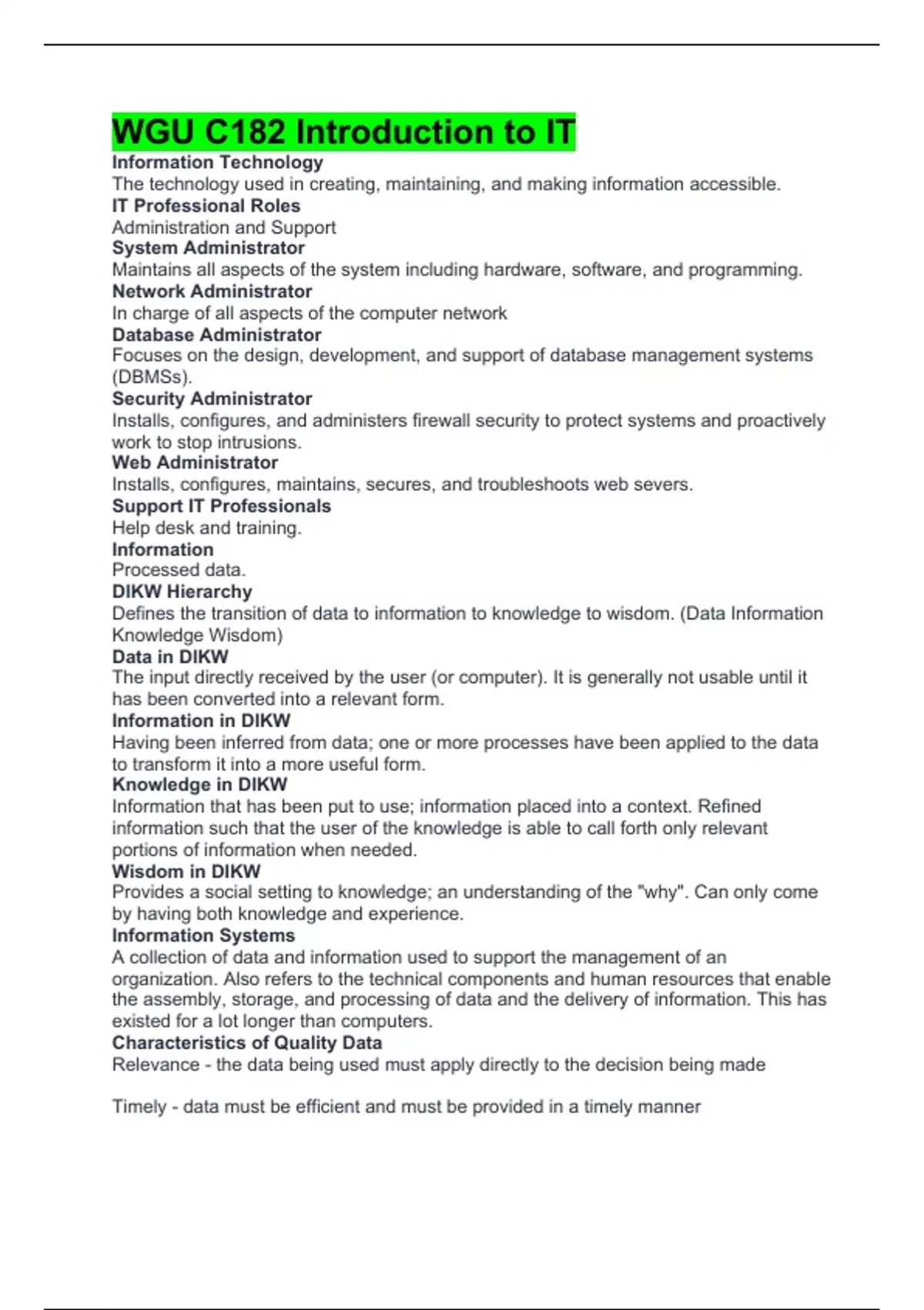 WGU C182 Introduction to IT Information Technology The technology used in creating, maintaining, and making information accessible. IT Professional Roles Administration and Support System Administrator Maintains all aspects of the system including hardware, software, and programming. Network Administrator In charge of all aspects of the computer network Database Administrator Focuses on the design, development, and support of database management systems (DBMSs). Security Administrator Installs, configures, and administers firewall security to protect systems and proactively work to stop intrusions. Web Administrator Installs, configures, maintains, secures, and troubleshoots web severs. Support IT Professionals Help desk and training. Information Processed data. DIKW Hierarchy Defines the transition of data to information to knowledge to wisdom. (Data Information Knowledge Wisdom) Data in DIKW The input directly received by the user (or computer). It is generally not usable until it has been converted into a relevant form. Information in DIKW Having been inferred from data; one or more processes have been applied to the data to transform it into a more useful form. Knowledge in DIKW Information that has been put to use; information placed into a context. Refined information such that the user of the knowledge is able to call forth only relevant portions of information when needed. Wisdom in DIKW Provides a social setting to knowledge; an understanding of the "why". Can only come by having both knowledge and experience. Information Systems A collection of data and information used to support the management of an organization. Also refers to the technical components and human resources that enable the assembly, storage, and processing of data and the delivery of information. This has existed for a lot longer than computers. Characteristics of Quality Data Relevance - the data being used must apply directly to the decision being made Timely - data must be efficient and must be provided in a timely manner Thorough - the data must be complete Accurate - data should be captured only once, where possible and should be captured as close to the point of activity as possible. Reliable - data should reflect stable and consistent data collection processes across collections points and over time IPOS The Input-Procession-Output-Storage Cycle Input Raw data is entered by the user. Processing Raw data is organized or structured for usefulness. Output Information is output so user can see results. Storage Processed information is stored for permanent record. Computer System A collection of components that work together to meet the needs of the user; typically categorized as either hardware, software, networks, or users. Hardware Physical components of a computer system which include the system unit and its components and peripheral devices; tangible aspects of the computer. Software Computer programs that tell the computer what to do--how to execute commands and process information Network A collection of computers and resources connected by various media so that they can communicate with each other. User Those who use a computer. Software Categories Systems Software and Applications Software Evolution of Users First users were the engineers who built and programmed computers, then employees who had received specialized training were users, and now today, anyone and everyone can be a user. Protocol Rules provided by which networks communicate with each other. TCP/IP Transmission Control Protocol/Internet Protocol. Most commonly used protocol; is required of all computers that communicate over the Internet. Protocol Stack A collection of protocols. TCP/IP is an example. Components of a Computer CPU, Memory and Storage, Peripheral Devices CPU Executes programs' instructions and commands various components in the computer. Referred to as the "chip". Memory Stores the programs being executed and the data they are using. I/O Subsystem All peripheral devices where long term storage devices are used. Bus Permits information to move between each component; electrical channels that enable communication among the electronic components System Unit Critical component of all computer based systems; consists of most of the hardware the computer needs in order to run; comes in a variety of shapes and sizes. Internal Components of the System Unit Case, Internal Bays, Buses, Ports, Hard Drive, Motherboard, CPU, CPU Cooler, Memory Module (RAM), Power Supply Unit (PSU), Expansion Slots/Cards Parts of the CPU Control Unit (CU) - retrieves the instructions and the raw data that is input and coordinates or controls the sending of those instructions and data to the ALU Arithmetic Logic Unit (ALU) - does the actual processing of the data; completing mathematical calculations and logical operations to process the data and converting the input of the keyboard text entry to output displayed on the screen System Clock Controls the speed at which instructions are processed. RAM Stands for Random Access Memory. It temporarily stores data before it is processed and sent to your screen or printer. It is volatile (means data or information stored disappears when the computer is turned off or loses power). You can choose the amount of RAM your computer has. Types of RAM Dynamic RAM (DRAM) - typically called main memory Static RAM (SRAM) - cache memory and registers BIOS ROM BIOS stands for Basic Input Output System; ROM stands for Read Only Memory. Typically stored in ROM chip on the motherboard. Is software not hardware, ("basic" operating system that runs when the computer is first turned on). Runs tests of memory and the CPU and initializes hardware components so that the actual Operating System can be loaded from the hard disk. Can't choose the amount or contents. 1st Generation of Computers Vacuum tubes, relay switches, the need to program in machine language 2nd Generation of Computers Transistor components, magnetic core memory, 