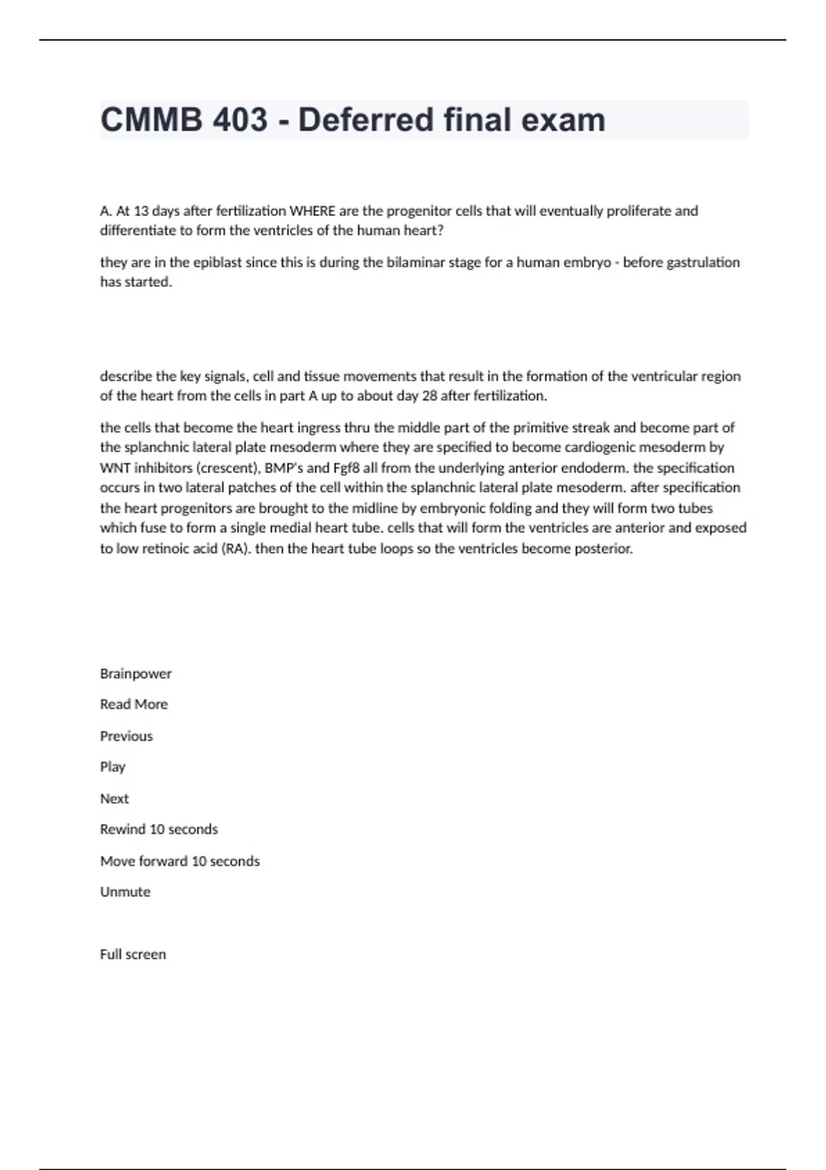 CMMB 403 - Deferred final examA. At 13 days after fertilization WHERE are the progenitor cells that will eventually proliferate and differentiate to form the ventricles of the human heart? they are in the epiblast since this is during the bilaminar stage for a human embryo - before gastrulation has started. describe the key signals, cell and tissue movements that result in the formation of the ventricular region of the heart from the cells in part A up to about day 28 after fertilization. the cells that become the heart ingress thru the middle part of the primitive streak and become part of the splanchnic lateral plate mesoderm where they are specified to become cardiogenic mesoderm by WNT inhibitors (crescent), BMP's and Fgf8 all from the underlying anterior endoderm. the specification occurs in two lateral patches of the cell within the splanchnic lateral plate mesoderm. after specification the heart progenitors are brought to the midline by embryonic folding and they will form two tubes which fuse to form a single medial heart tube. cells that will form the ventricles are anterior and exposed to low retinoic acid (RA). then the heart tube loops so the ventricles become posterior. Brainpower Read More Previous Play Next Rewind 10 seconds Move forward 10 seconds Unmute Full screen