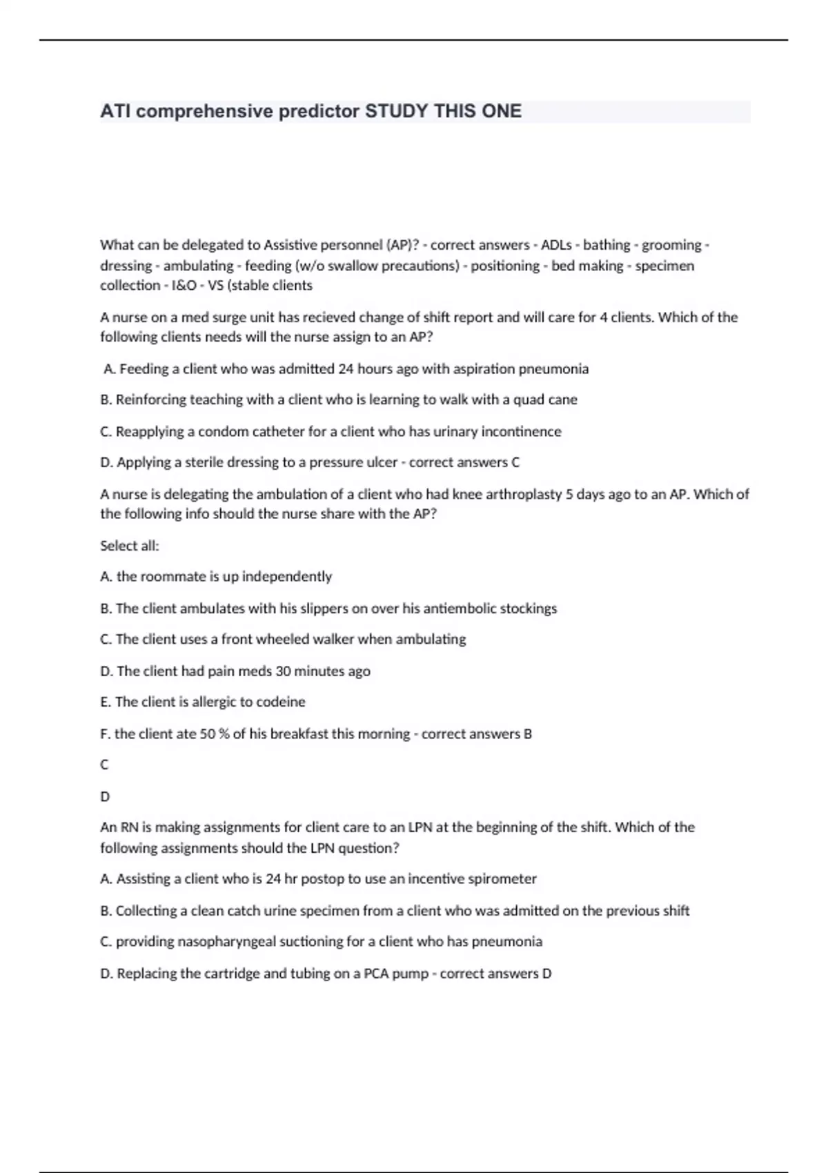 ATI comprehensive predictor STUDY THIS ONE What can be delegated to Assistive personnel (AP)? - correct answers - ADLs - bathing - grooming - dressing - ambulating - feeding (w/o swallow precautions) - positioning - bed making - specimen collection - I&O - VS (stable clients A nurse on a med surge unit has recieved change of shift report and will care for 4 clients. Which of the following clients needs will the nurse assign to an AP? A. Feeding a client who was admitted 24 hours ago with aspiration pneumonia B. Reinforcing teaching with a client who is learning to walk with a quad cane C. Reapplying a condom catheter for a client who has urinary incontinence D. Applying a sterile dressing to a pressure ulcer - correct answers C A nurse is delegating the ambulation of a client who had knee arthroplasty 5 days ago to an AP. Which of the following info should the nurse share with the AP? Select all: A. the roommate is up independently B. The client ambulates with his slippers on over his antiembolic stockings C. The client uses a front wheeled walker when ambulating D. The client had pain meds 30 minutes ago E. The client is allergic to codeine F. the client ate 50 % of his breakfast this morning - correct answers B C D An RN is making assignments for client care to an LPN at the beginning of the shift. Which of the following assignments should the LPN question? A. Assisting a client who is 24 hr postop to use an incentive spirometer B. Collecting a clean catch urine specimen from a client who was admitted on the previous shift C. providing nasopharyngeal suctioning for a client who has pneumonia D. Replacing the cartridge and tubing on a PCA pump - correct answers D A nurse is preparing an inservice program about delegation. Which of the following elements should she identify when presenting the 5 rights of delegation. Select all: A. Right client B. Right supervision/evaluation C. Right direction/communication D. Right time E. Right circumstances - correct answers B C E A nurse manager of a med surge unit is assigning care responsibilities for the oncoming shift. A client is waiting transfer back to the unit from the PACU following thoracic surgery. To which staff member should the nurse assign the client? A. Charge nurse B. RN C. LVN D. AP - correct answers B What is the study of conduct and character? - correct answers Ethics What are the values and beliefs that guide behavior and decision making? - correct answers Morals What is the right to make ones own personal decisions, even tho those decisions might not be in the persons best interest - correct answers Autonomy What are positive actions to help others - correct answers Beneficience What is an agreement to keep promises - correct answers Fidelity What is fairness in care delivery and use of resources - correct answers Justice What is avoidance of harm or injury - correct answers Non-maleficence A nurse is caring for a client who decides not to have surgery despite significant blockages in his coronary arteries. The nurse understands that this clients choice is an example of what principles? A. Fidelity B. Autonomy C. Justice D. Nonmalificience - correct answers A