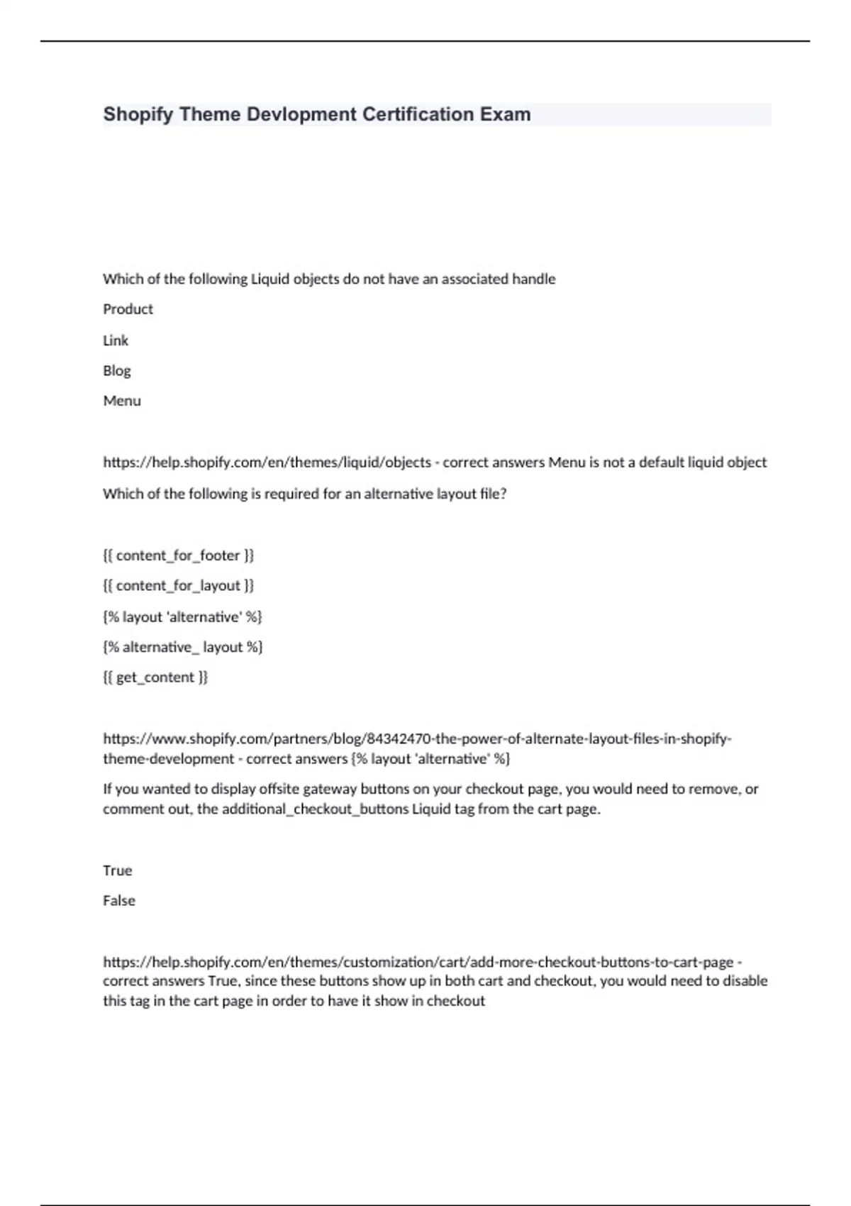 Shopify Theme Devlopment Certification Exam Which of the following Liquid objects do not have an associated handle Product Link Blog Menu Which of the following is required for an alternative layout file? {{ content_for_footer }} {{ content_for_layout }} {% layout 'alternative' %} {% alternative_ layout %} {{ get_content }} If you wanted to display offsite gateway buttons on your checkout page, you would need to remove, or comment out, the additional_checkout_buttons Liquid tag from the cart page. True False Multiple filters can be applied to a single output. Filters are applied in order from: Left to right Right to left You can use parentheses to dictate the order What's the maximum size a theme zip file can be? 20 MB 50 MB 100 MB There is no limit - correct answers 50 MB If you are running Yarn, which Slate command will generate a new Slate project? yarn create slate-theme my-new-theme yarn slate create-theme my-new-theme yarn slate build-theme my-new-theme yarn create slate-build my-new-theme To submit a theme to the Shopify Theme Store, you must be approved as a Shopify Design Expert. True False - correct answers True If a custom SEO description isn't provided for a product, then the product description will be used as the meta description instead. True False