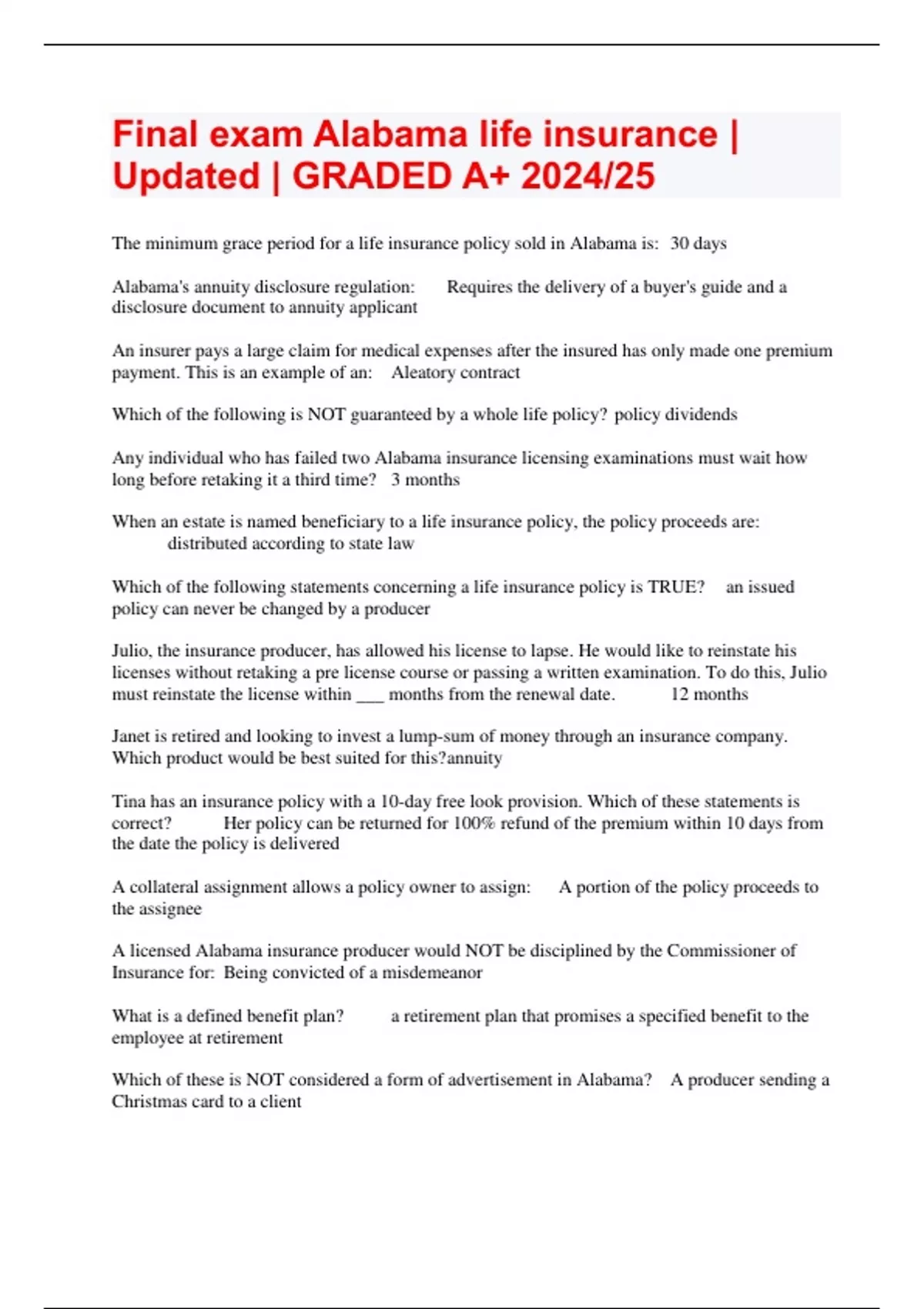Final exam Alabama life insurance | Updated | GRADED A+ 2024/25