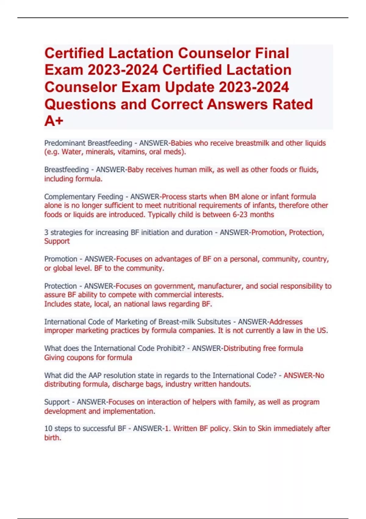 Certified Lactation Counselor Final Exam Certified Lactation Counselor Exam Update Questions and Correct Answers Rated A+