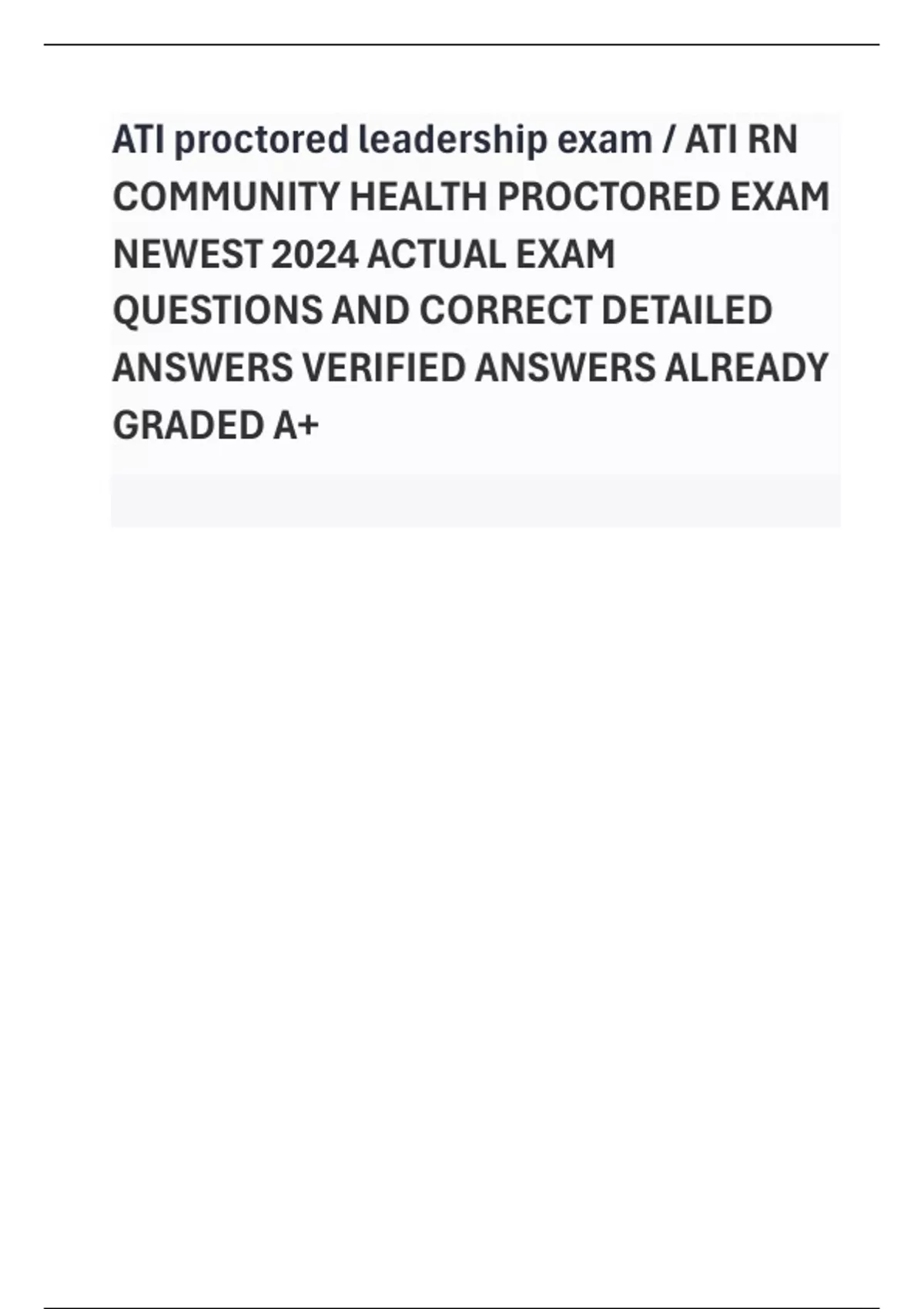 ATI proctored leadership exam / ATI RN COMMUNITY HEALTH PROCTORED EXAM NEWEST 2024 ACTUAL EXAM QUESTIONS AND CORRECT DETAILED ANSWERS VERIFIED ANSWERS ALREADY GRADED A+