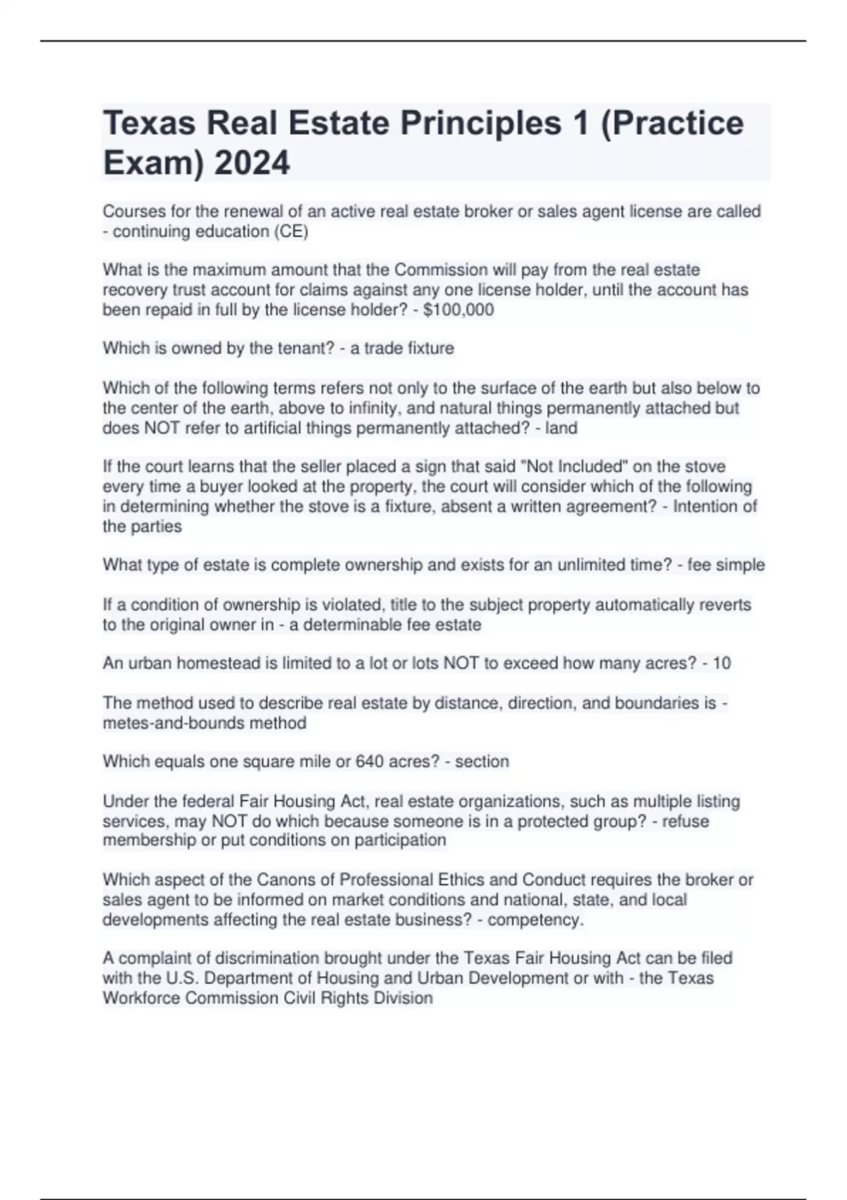 Courses for the renewal of an active real estate broker or sales agent license are called - continuing education (CE) What is the maximum amount that the Commission will pay from the real estate recovery trust account for claims against any one license holder, until the account has been repaid in full by the license holder? - $100,000 Which is owned by the tenant? - a trade fixture Which of the following terms refers not only to the surface of the earth but also below to the center of the earth, above to infinity, and natural things permanently attached but does NOT refer to artificial things permanently attached? - land If the court learns that the seller placed a sign that said "Not Included" on the stove every time a buyer looked at the property, the court will consider which of the following in determining whether the stove is a fixture, absent a written agreement? - Intention of the parties What type of estate is complete ownership and exists for an unlimited time? - fee simple If a condition of ownership is violated, title to the subject property automatically reverts to the original owner in - a determinable fee estate An urban homestead is limited to a lot or lots NOT to exceed how many acres? - 10 The method used to describe real estate by distance, direction, and boundaries is - metes-and-bounds method Which equals one square mile or 640 acres? - section Under the federal Fair Housing Act, real estate organizations, such as multiple listing services, may NOT do which because someone is in a protected group? - refuse membership or put conditions on participation Which aspect of the Canons of Professional Ethics and Conduct requires the broker or sales agent to be informed on market conditions and national, state, and local developments affecting the real estate business? - competency. A complaint of discrimination brought under the Texas Fair Housing Act can be filed with the U.S. Department of Housing and Urban Development or with - the Texas Workforce Commission Civil Rights Division