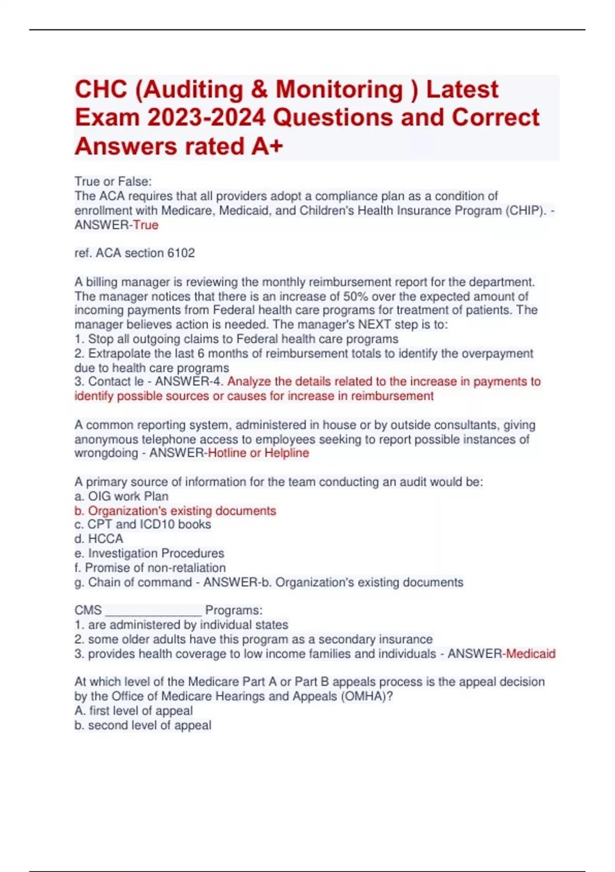 CHC (Auditing & Monitoring ) Latest Exam Questions and Correct Answers rated A+