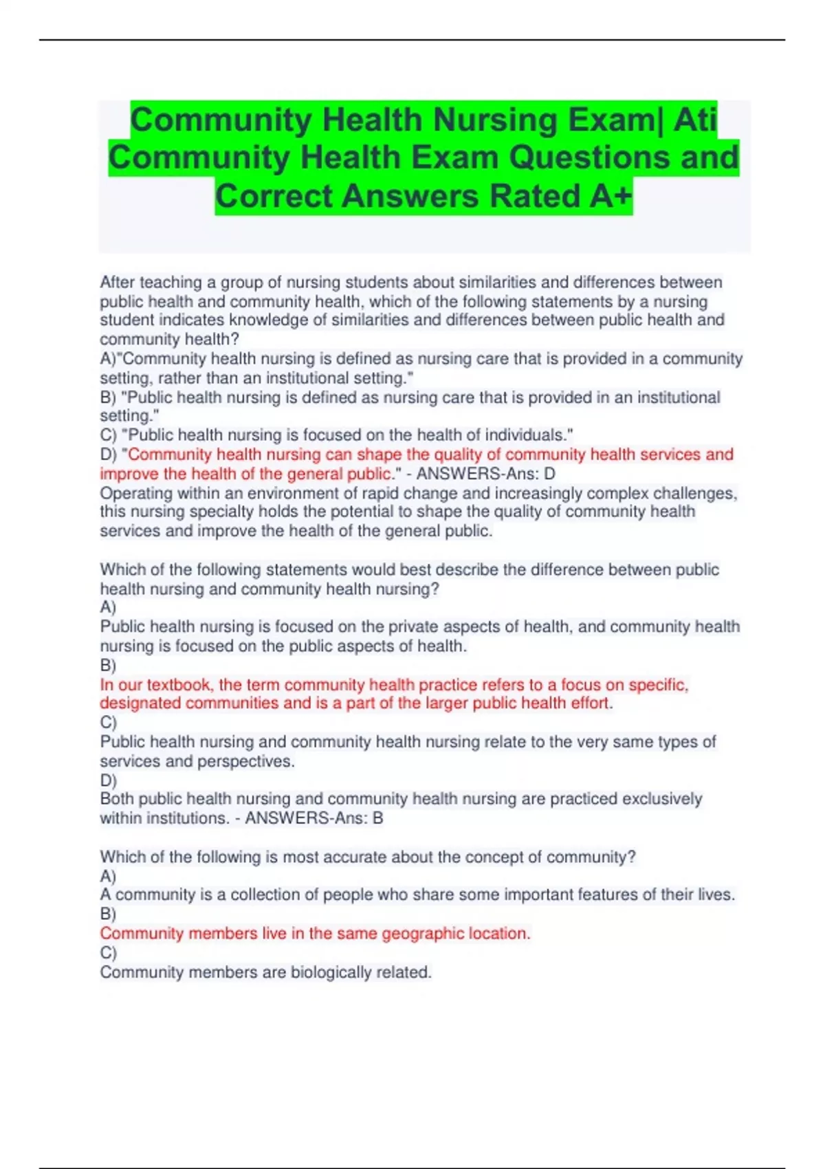 Community Health Nursing Exam| Ati Community Health Exam Questions and Correct Answers Rated A+