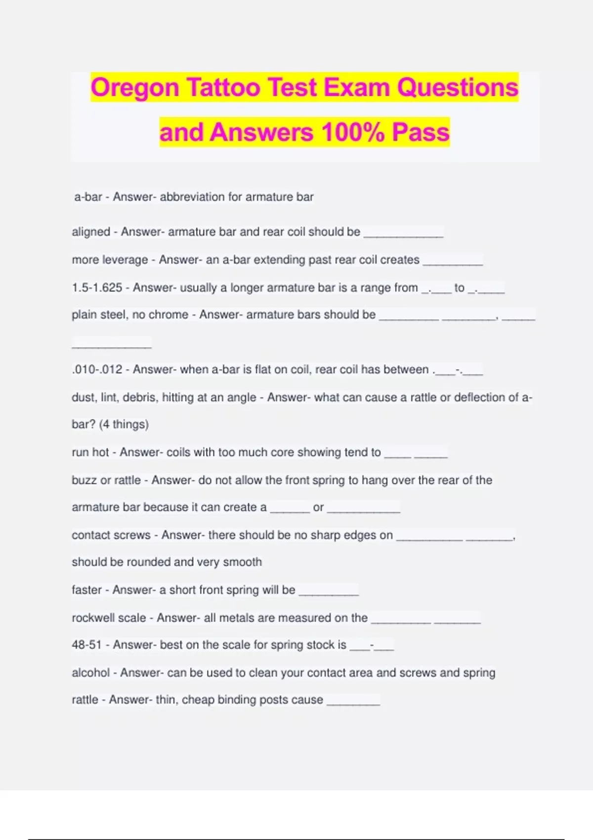 Oregon Tattoo Test Exam Questions and Answers 100% Pass a-bar - Answer- abbreviation for armature bar aligned - Answer- armature bar and rear coil should be ____________ more leverage - Answer- an a-bar extending past rear coil creates _________ 1.5-1.625 - Answer- usually a longer armature bar is a range from _.___ to _.____ plain steel, no chrome - Answer- armature bars should be _________ ________, _____ ____________ .010-.012 - Answer- when a-bar is flat on coil, rear coil has between .___-.___ dust, lint, debris, hitting at an angle - Answer- what can cause a rattle or deflection of a- bar? (4 things) run hot - Answer- coils with too much core showing tend to ____ _____ buzz or rattle - Answer- do not allow the front spring to hang over the rear of the armature bar because it can create a ______ or ___________ contact screws - Answer- there should be no sharp edges on __________ _______, should be rounded and very smooth faster - Answer- a short front spring will be _________ rockwell scale - Answer- all metals are measured on the _________ _______ 48-51 - Answer- best on the scale for spring stock is ___-___ alcohol - Answer- can be used to clean your contact area and screws and spring rattle - Answer- thin, cheap binding posts cause ________ leverage - Answer- _____________ is a key factor when it comes to a-bar choice 100 - Answer- copper is ___% conductive copper and zinc - Answer- brass is a mixture of 6-32, 8-32 - Answer- some machines have _-__ threaded machine screws and some have _-__ thicker binding posts - Answer- _________ __________ ______ help dampen vibrations shorter - Answer- is a shorter or longer front spring better on a liner? shoulder washers - Answer- screw insulators commonly known as __________ __________ , most common are made of fiber and plastic true - Answer- a longer A-Bar has more leverage, true or false? electrical contact to contact screw - Answer- purpose of the binding post rubber grommets - Answer- dampener or rubber grommets better? hot - Answer- never use brass screws or any other non-ferrous screws for the coil screws can cause the coils to get ___ soldering lugs - Answer- ______________ ____ are soldered at the ends of the coil wires and capacitor wires, with a 5/16" tube vise liners - Answer- tattoo machine capacitors have 22 MFD for ________ shaders - Answer- tattoo machine capacitors have 47 MFD for _________