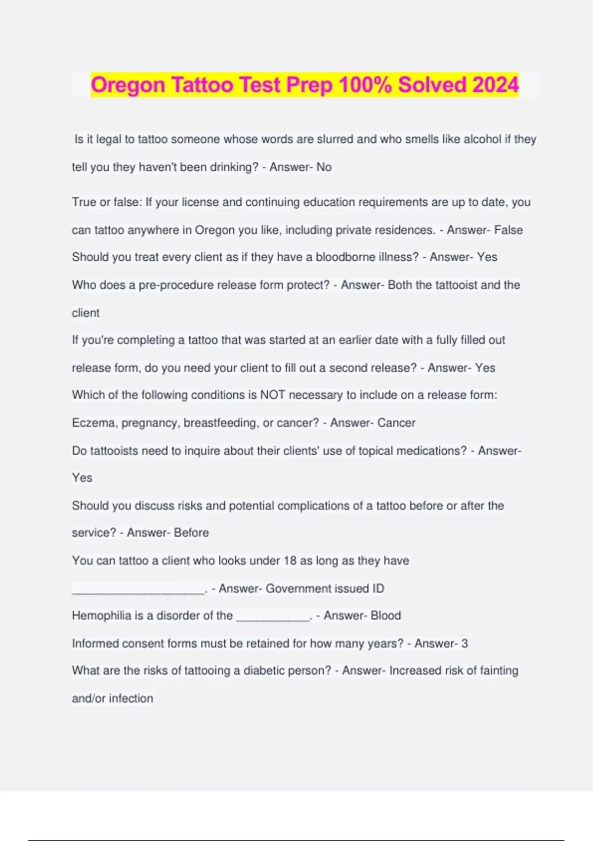 Oregon Tattoo Test Prep 100% Solved 2024 Is it legal to tattoo someone whose words are slurred and who smells like alcohol if they tell you they haven't been drinking? - Answer- No True or false: If your license and continuing education requirements are up to date, you can tattoo anywhere in Oregon you like, including private residences. - Answer- False Should you treat every client as if they have a bloodborne illness? - Answer- Yes Who does a pre-procedure release form protect? - Answer- Both the tattooist and the client If you're completing a tattoo that was started at an earlier date with a fully filled out release form, do you need your client to fill out a second release? - Answer- Yes Which of the following conditions is NOT necessary to include on a release form: Eczema, pregnancy, breastfeeding, or cancer? - Answer- Cancer Do tattooists need to inquire about their clients' use of topical medications? - Answer- Yes Should you discuss risks and potential complications of a tattoo before or after the service? - Answer- Before You can tattoo a client who looks under 18 as long as they have ____________________. - Answer- Government issued ID Hemophilia is a disorder of the ___________. - Answer- Blood Informed consent forms must be retained for how many years? - Answer- 3 What are the risks of tattooing a diabetic person? - Answer- Increased risk of fainting and/or infection It is common for tattooists to wipe the skin with __________ prior to a tattoo - Answer- Green soap What is the minimum number of pairs of gloves that should be used from prep to clean- up during a tattoo service? - Answer- Three When changing colors during a service, you want to be sure to use ______________ water. - Answer- Distilled What do most tattooists use to lighten black ink to grey? - Answer- Witch hazel Which colors should be tattooed first, light or dark? - Answer- Dark How many weeks should one wait before touching up a tattoo? - Answer- Three What is the hardest color to cover up? - Answer- Carbon black In a tattoo service, you must use _________ soap. - Answer- Liquid Drawing directly on one's client is allowed so long as the pen used is __________________. - Answer- Disposed of after service Do tattooists still face a higher risk of bloodborne infection than an office worker even if they follow all the standard precautions of tattooing and wear PPE? - Answer- Yes Which of the following is NOT a bloodborne disease: Hepatitis A, HIV, ebola, or leukemia? - Answer- Leukemia If you only touch an unclean steel surface for a second, can you still get a bloodborne disease? - Answer- Yes There is an effective vaccine for ______________, which all tattooists are required to either receive or present a waiver for. - Answer- Hepatitis B How long can some bloodborne pathogens survive for in dried blood? - Answer- Over a week