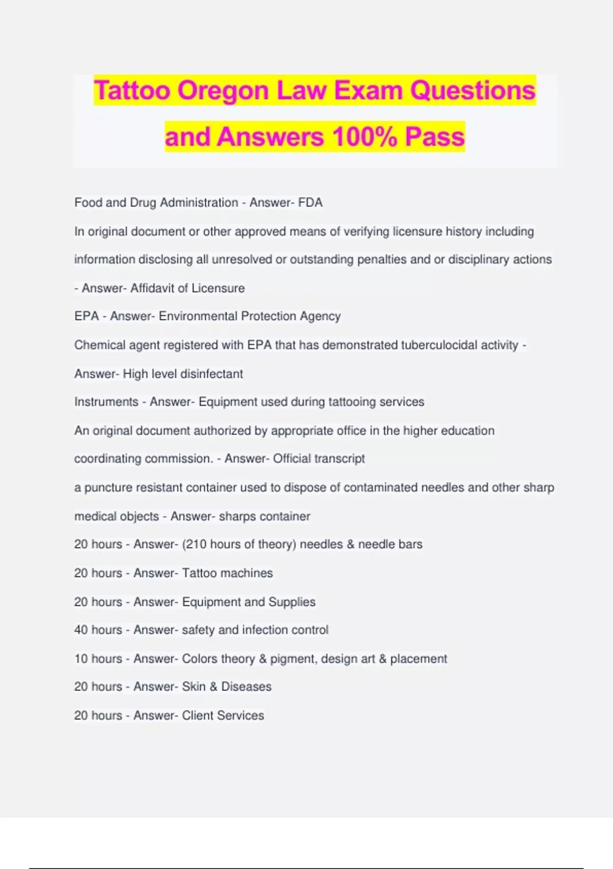 Tattoo Oregon Law Exam Questions and Answers 100% Pass Food and Drug Administration - Answer- FDA In original document or other approved means of verifying licensure history including information disclosing all unresolved or outstanding penalties and or disciplinary actions - Answer- Affidavit of Licensure EPA - Answer- Environmental Protection Agency Chemical agent registered with EPA that has demonstrated tuberculocidal activity - Answer- High level disinfectant Instruments - Answer- Equipment used during tattooing services An original document authorized by appropriate office in the higher education coordinating commission. - Answer- Official transcript a puncture resistant container used to dispose of contaminated needles and other sharp medical objects - Answer- sharps container 20 hours - Answer- (210 hours of theory) needles & needle bars 20 hours - Answer- Tattoo machines 20 hours - Answer- Equipment and Supplies 40 hours - Answer- safety and infection control 10 hours - Answer- Colors theory & pigment, design art & placement 20 hours - Answer- Skin & Diseases 20 hours - Answer- Client Services