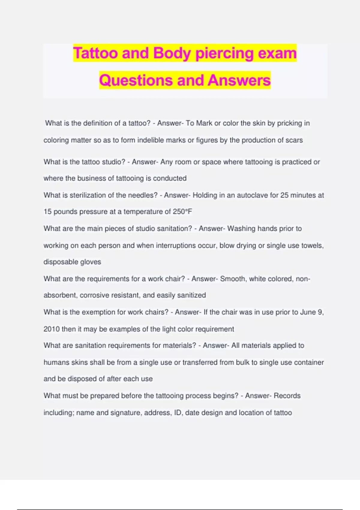 Tattoo and Body piercing exam Questions and Answers What is the definition of a tattoo? - Answer- To Mark or color the skin by pricking in coloring matter so as to form indelible marks or figures by the production of scars What is the tattoo studio? - Answer- Any room or space where tattooing is practiced or where the business of tattooing is conducted What is sterilization of the needles? - Answer- Holding in an autoclave for 25 minutes at 15 pounds pressure at a temperature of 250°F What are the main pieces of studio sanitation? - Answer- Washing hands prior to working on each person and when interruptions occur, blow drying or single use towels, disposable gloves What are the requirements for a work chair? - Answer- Smooth, white colored, non- absorbent, corrosive resistant, and easily sanitized What is the exemption for work chairs? - Answer- If the chair was in use prior to June 9, 2010 then it may be examples of the light color requirement What are sanitation requirements for materials? - Answer- All materials applied to humans skins shall be from a single use or transferred from bulk to single use container and be disposed of after each use What must be prepared before the tattooing process begins? - Answer- Records including; name and signature, address, ID, date design and location of tattoo