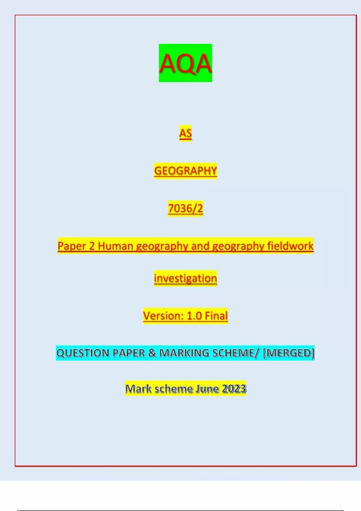 AQA AS GEOGRAPHY 7036/2 PAPER 2 HUMAN GEOGRAPHY AND GEOGRAPHY FIELDWORK INVESTIGATION VERSION 1.0 FINAL QUESTION PAPER WITH MERGED MARKING SCHEME |JUNE 2023