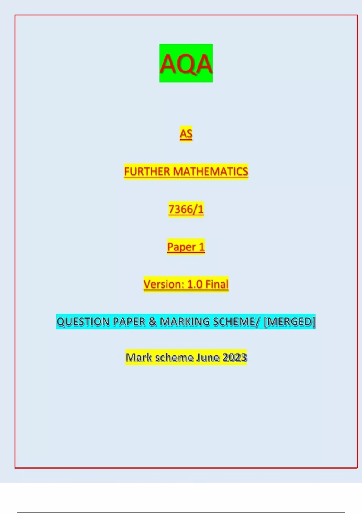 AQA AS FURTHER MATHEMATICS 7366/1 PAPER 1 VERSION 1.0 FINAL QUESTIONS WITH A MERGED MARKING SCHEME|JUNE 2023