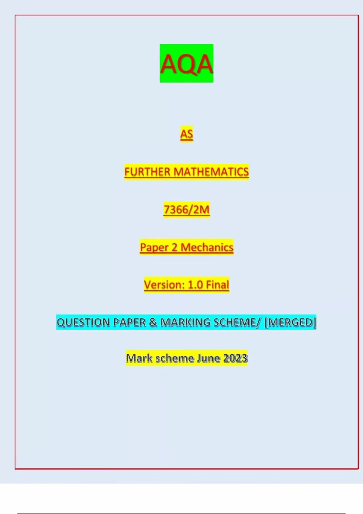AQA AS FURTHER MATHEMATICS 73666/2M PAPER 2 MECHANICS VERSION 1.0 FINAL QUESTIONS WITH MERGED ANSWERS |JUNE 2023