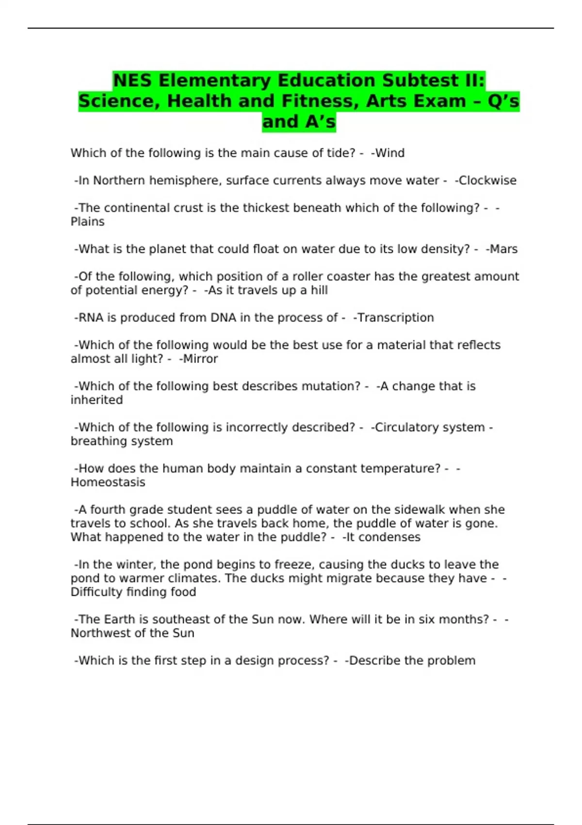 NES Elementary Education Subtest II: Science, Health and Fitness, Arts Exam – Q’s and A’s