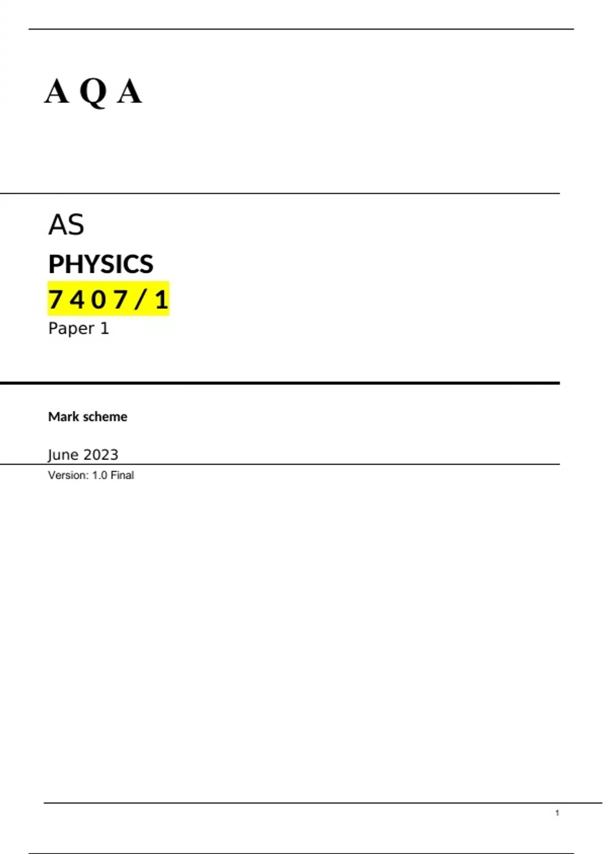 AQA AS LEVEL PHYSICS PAPER 1 Mark scheme and Question paper for June 2023