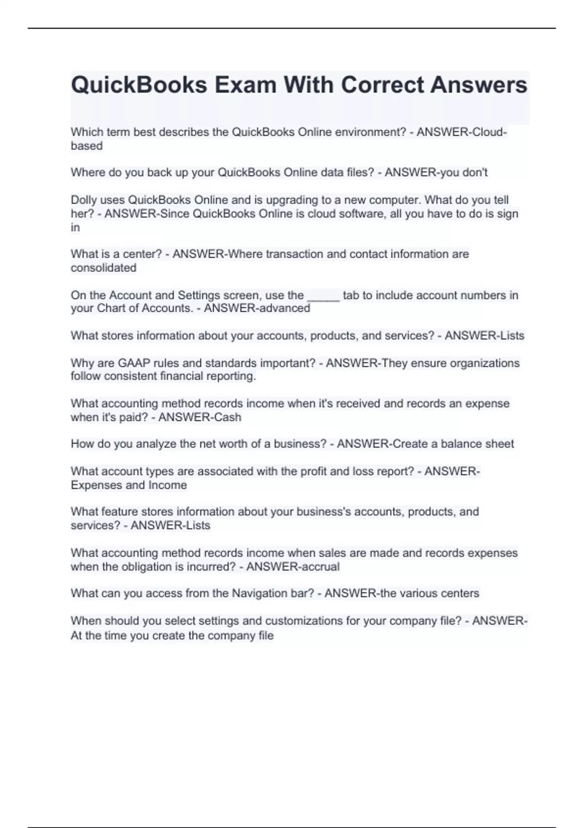 Why are GAAP rules and standards important? - ANSWER-They ensure organizations follow consistent financial reporting. What accounting method records income when it's received and records an expense when it's paid? - ANSWER-Cash How do you analyze the net worth of a business? - ANSWER-Create a balance sheet What account types are associated with the profit and loss report? - ANSWER-Expenses and Income What feature stores information about your business's accounts, products, and services? - ANSWER-Lists What accounting method records income when sales are made and records expenses when the obligation is incurred? - ANSWER-accrual What can you access from the Navigation bar? - ANSWER-the various centers When should you select settings and customizations for your company file? - ANSWER-At the time you create the company file