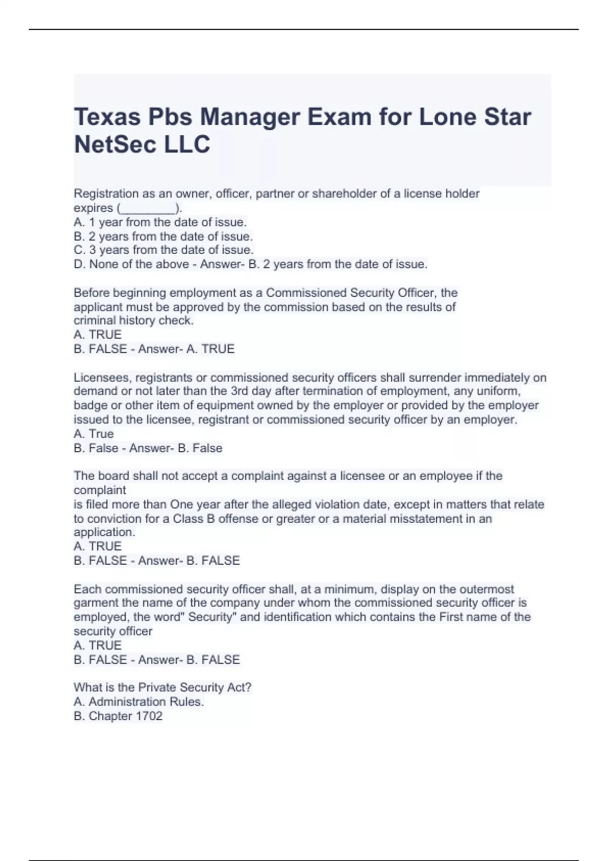 Texas Pbs Manager Exam for Lone Star NetSec LLC Questions with correct Answers 2024