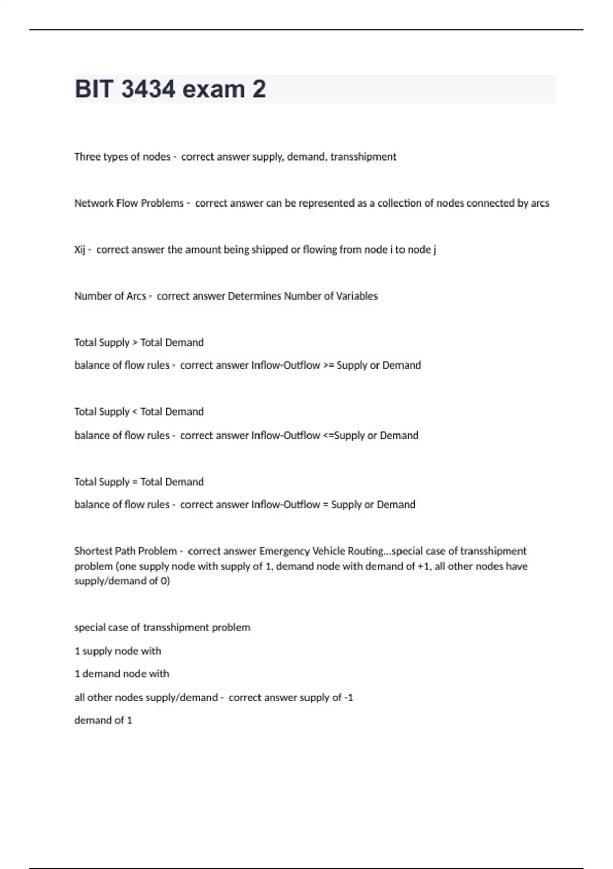 BIT 3434 exam 2Three types of nodes - correct answer supply, demand, transshipment Network Flow Problems - correct answer can be represented as a collection of nodes connected by arcs Xij - correct answer the amount being shipped or flowing from node i to node j Number of Arcs - correct answer Determines Number of Variables Total Supply > Total Demand balance of flow rules - correct answer Inflow-Outflow >= Supply or Demand Total Supply < Total Demand balance of flow rules - correct answer Inflow-Outflow <=Supply or Demand Total Supply = Total Demand balance of flow rules - correct answer Inflow-Outflow = Supply or Demand Shortest Path Problem - correct answer Emergency Vehicle Routing...special case of transshipment problem (one supply node with supply of 1, demand node with demand of +1, all other nodes have supply/demand of 0) special case of transshipment problem 1 supply node with 1 demand node with all other nodes supply/demand - correct answer supply of -1 demand of 1