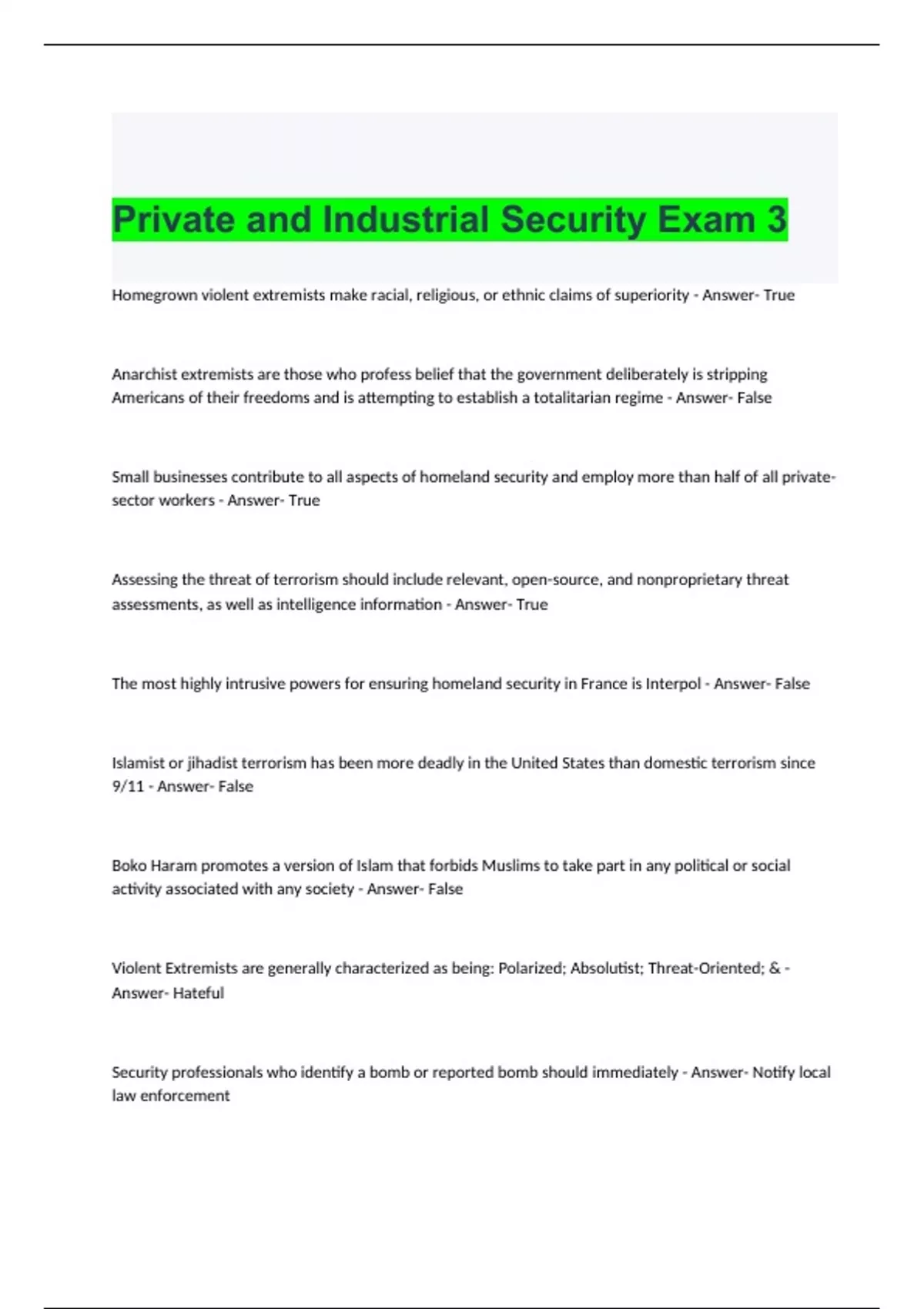 Private and Industrial Security Exam 3 Questions and Answers