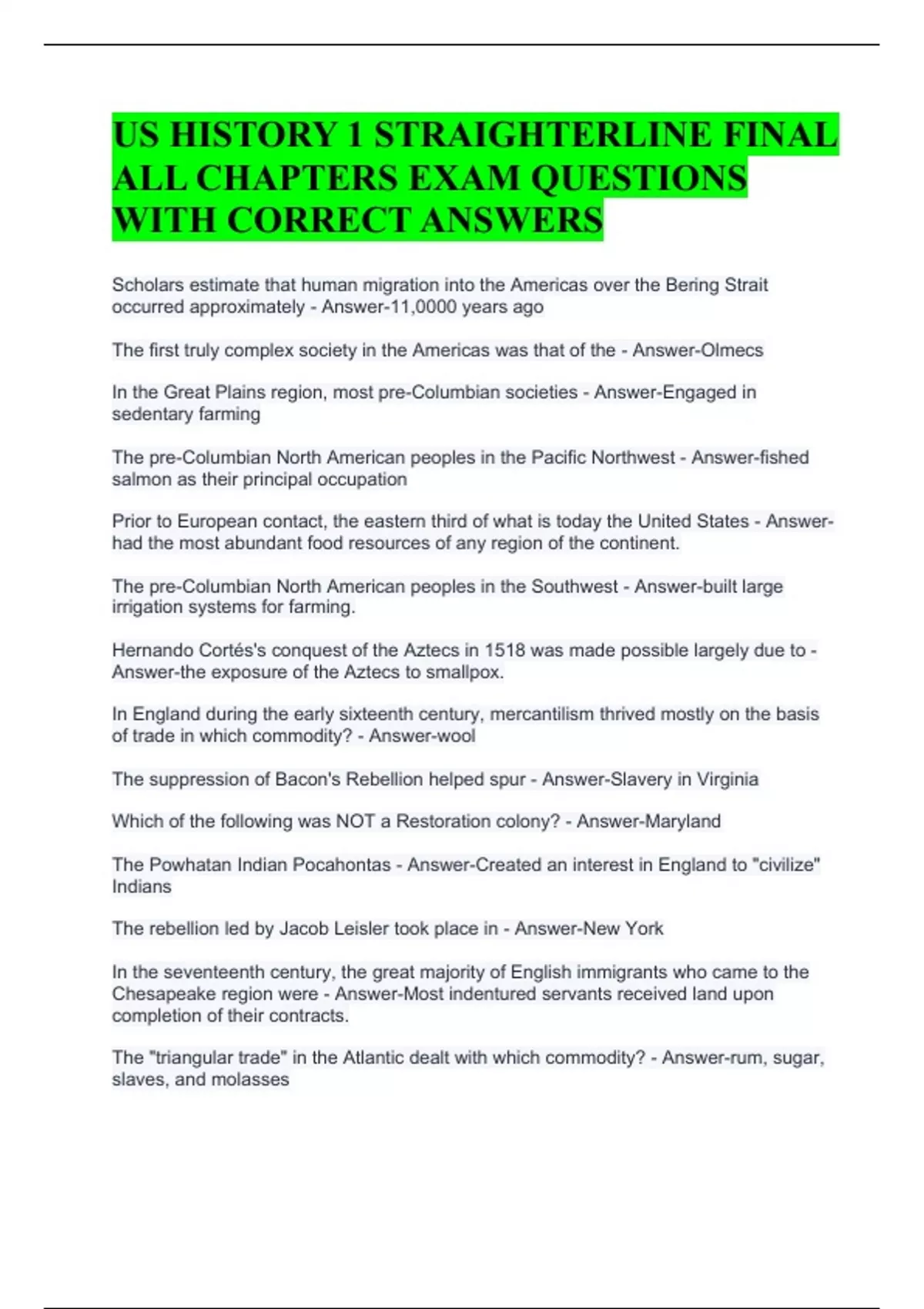 US HISTORY 1 STRAIGHTERLINE FINAL ALL CHAPTERS EXAM QUESTIONS WITH CORRECT ANSWERS