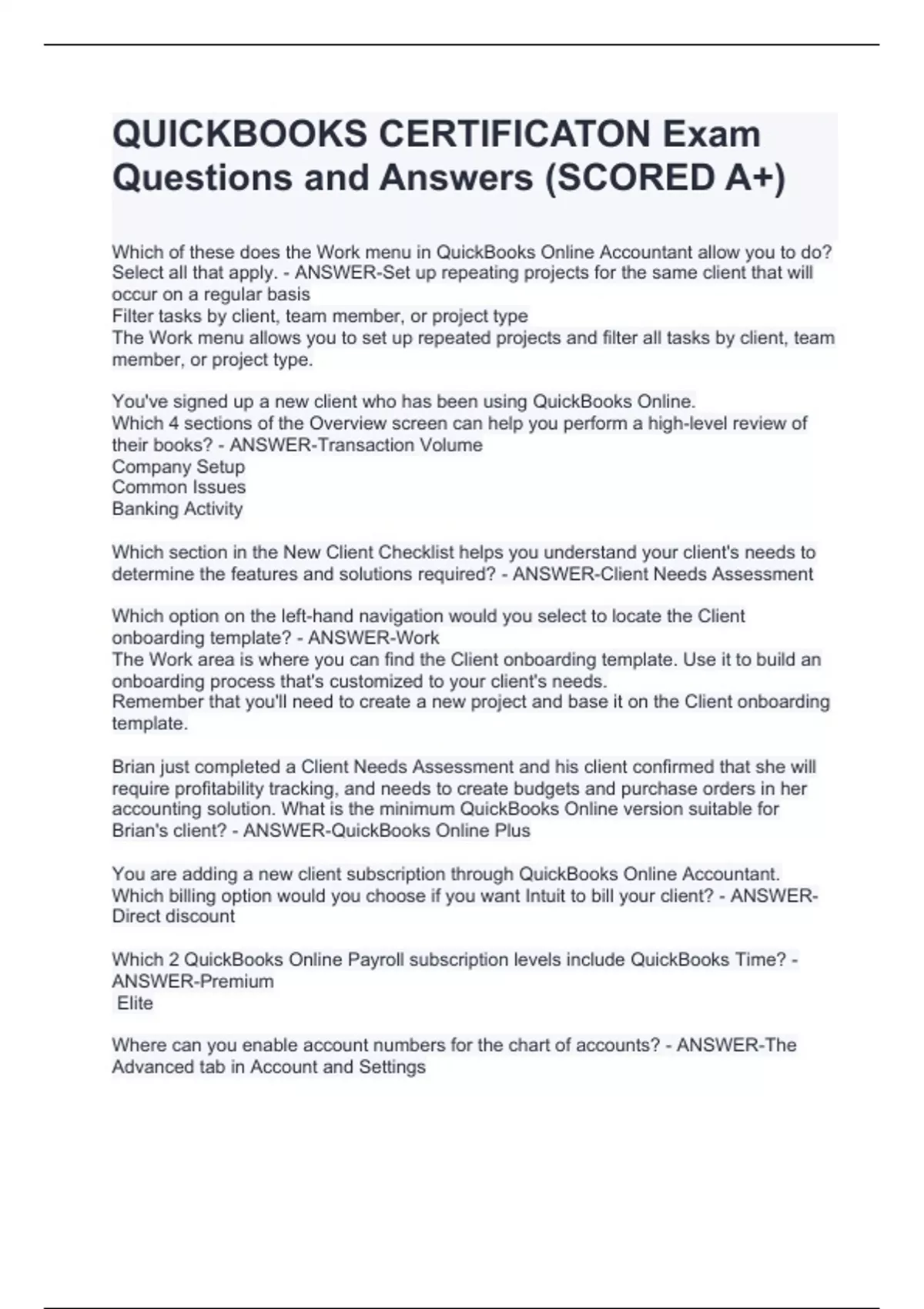 You've signed up a new client who has been using QuickBooks Online. Which 4 sections of the Overview screen can help you perform a high-level review of their books? - ANSWER-Transaction Volume Company Setup Common Issues Banking Activity Which section in the New Client Checklist helps you understand your client's needs to determine the features and solutions required? - ANSWER-Client Needs Assessment Which option on the left-hand navigation would you select to locate the Client onboarding template? - ANSWER-Work The Work area is where you can find the Client onboarding template. Use it to build an onboarding process that's customized to your client's needs. Remember that you'll need to create a new project and base it on the Client onboarding template. Brian just completed a Client Needs Assessment and his client confirmed that she will require profitability tracking, and needs to create budgets and purchase orders in her accounting solution. What is the minimum QuickBooks Online version suitable for Brian's client? - ANSWER-QuickBooks Online Plus You are adding a new client subscription through QuickBooks Online Accountant. Which billing option would you choose if you want Intuit to bill your client? - ANSWER-Direct discount Which 2 QuickBooks Online Payroll subscription levels include QuickBooks Time? - ANSWER-Premium Elite Where can you enable account numbers for the chart of accounts? - ANSWER-The Advanced tab in Account and Settings