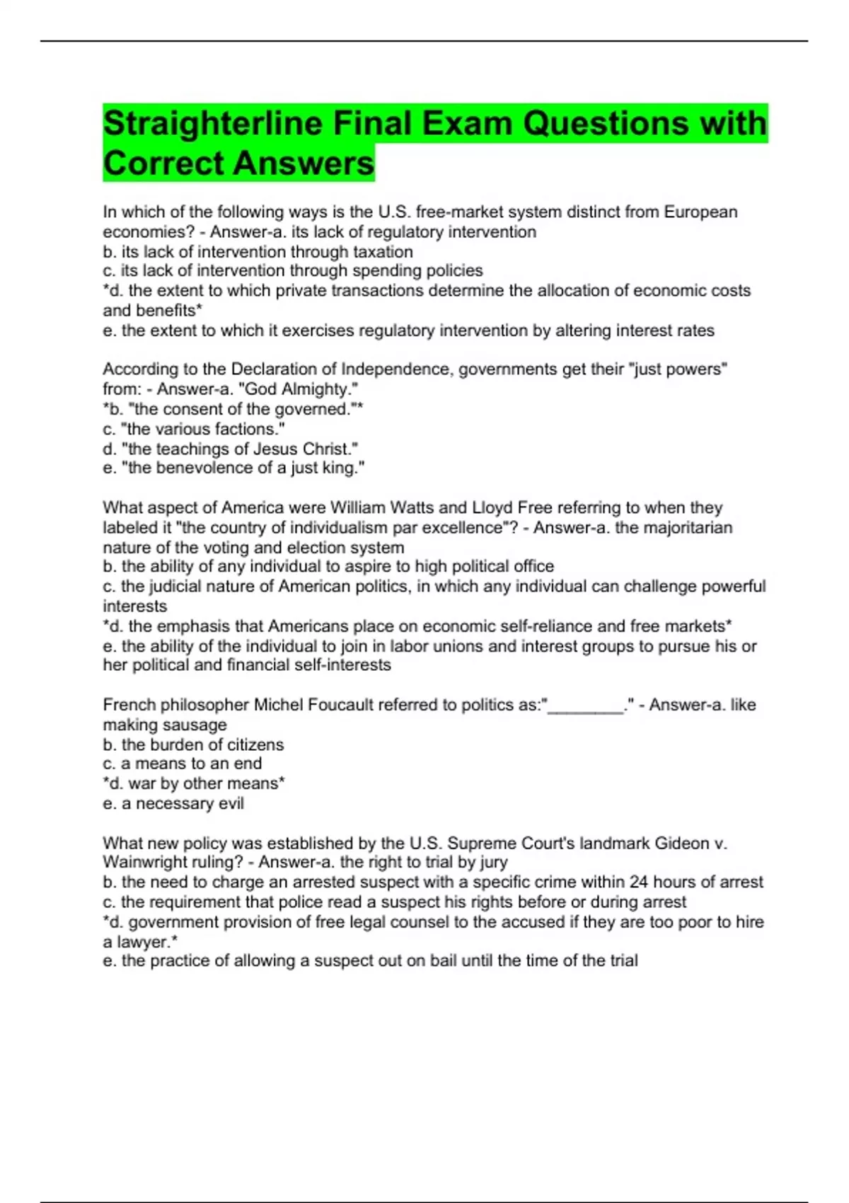 Straighterline Final Exam Questions with Correct Answers Edmund Burke's idea of representatives as trustees was based on the claim that - Answer-*a. representatives should follow their own judgment of the public interest.* b. representatives should follow the voters' judgment of the public interest. c. indirect election is a more trustworthy means of discovering the public interest. d. direct election is a more trustworthy means of discovering the public interest. e. None of these answers is correct. Where is the Bill of Rights found in the constitution - Answer-a. Article I, Section 8 b. Article II *c. the first ten amendments* d. amendments 17 through 26 e. Article III Judicial review is the power of the American courts to - Answer-*a. declare a law unconstitutional* b. suspend the writ of habeas corpus. c. impeach the president. d. give advisory opinions to Congress. e. give advice and counsel to the president. Which of the following aspects of US. government might be used as part of an argument that the US is less democratic than some other democracies? - Answer-a. the extension of popular direct election to office b. the frequency of election of its larger legislative body c. its extensive reliance on primary elections d. the frequency of election of its chief executive *e. its staggered terms of office of members of the legislature* In his criticism of the Constitution, the economist Charles Beard argued that: - Answer-*a. the Constitution's elaborate systems of power and representation were designed to protect the interests of the rich.*
