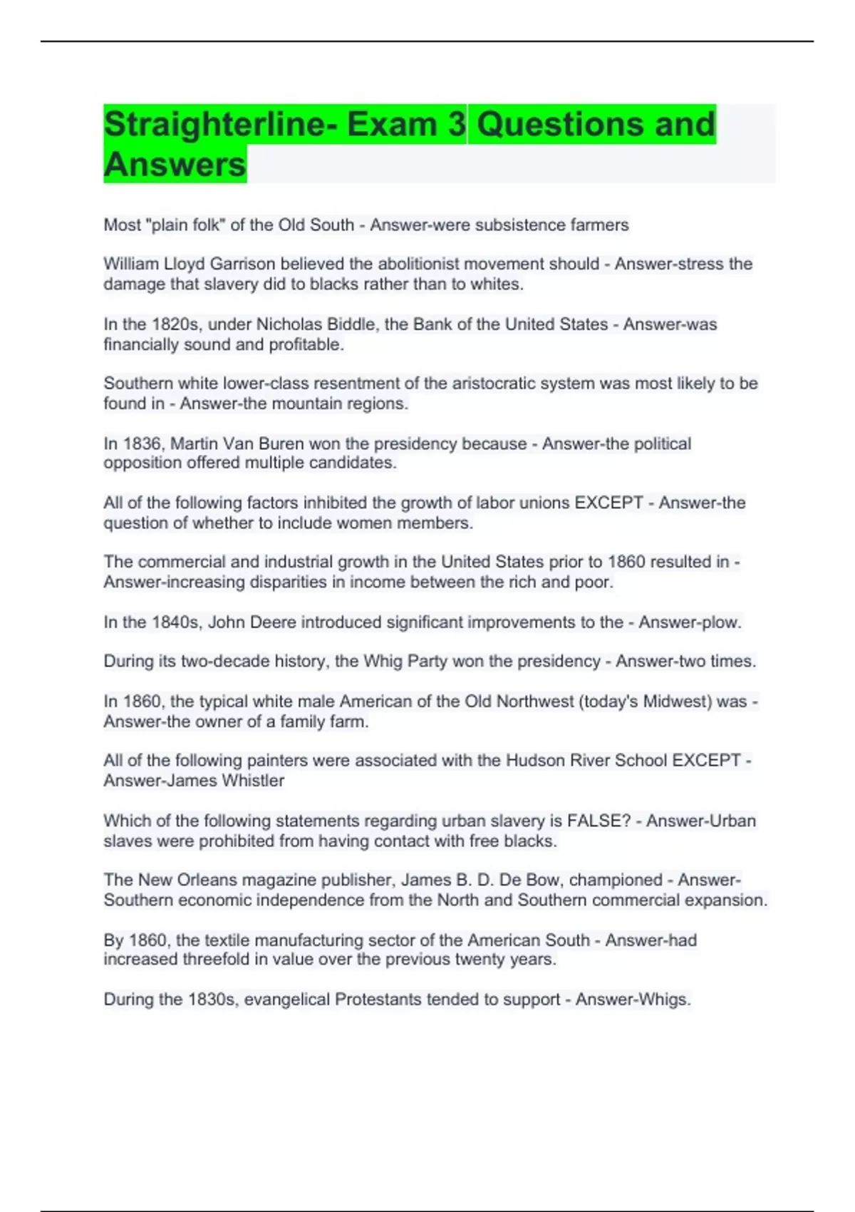 Straighterline- Exam 3 Questions and Answers Prior to 1860, prison reform in the United States - Answer-included the practice of solitary confinement. By 1828, in all but one state, presidential electors were chosen by - Answer-popular vote. In the 1830s and 1840s, abolitionists were divided - Answer-by radicals and moderates within their ranks over whether or not to use violence. by calls for Northern and Southern separation. over the question of female equality. The slave codes of the American South - Answer-defined anyone with a trace of African ancestry as black. The main staple crop of the Old Northwest (today's Midwest) was - Answer-Wheat. In the 1840s in the United States, an initial understanding of germ theory was made by - Answer-Oliver Wendell Holmes. Prior to the Civil War, the religious denomination most active in feminism was the - Answer-Quakers. By 1866, telegraphic communication - Answer-existed between the United States and Europe Tobacco cultivation in the antebellum South - Answer-was gradually moving westward. In 1830, what political figure said, "Our Federal Union—It must be preserved"? - Answer-Andrew Jackson