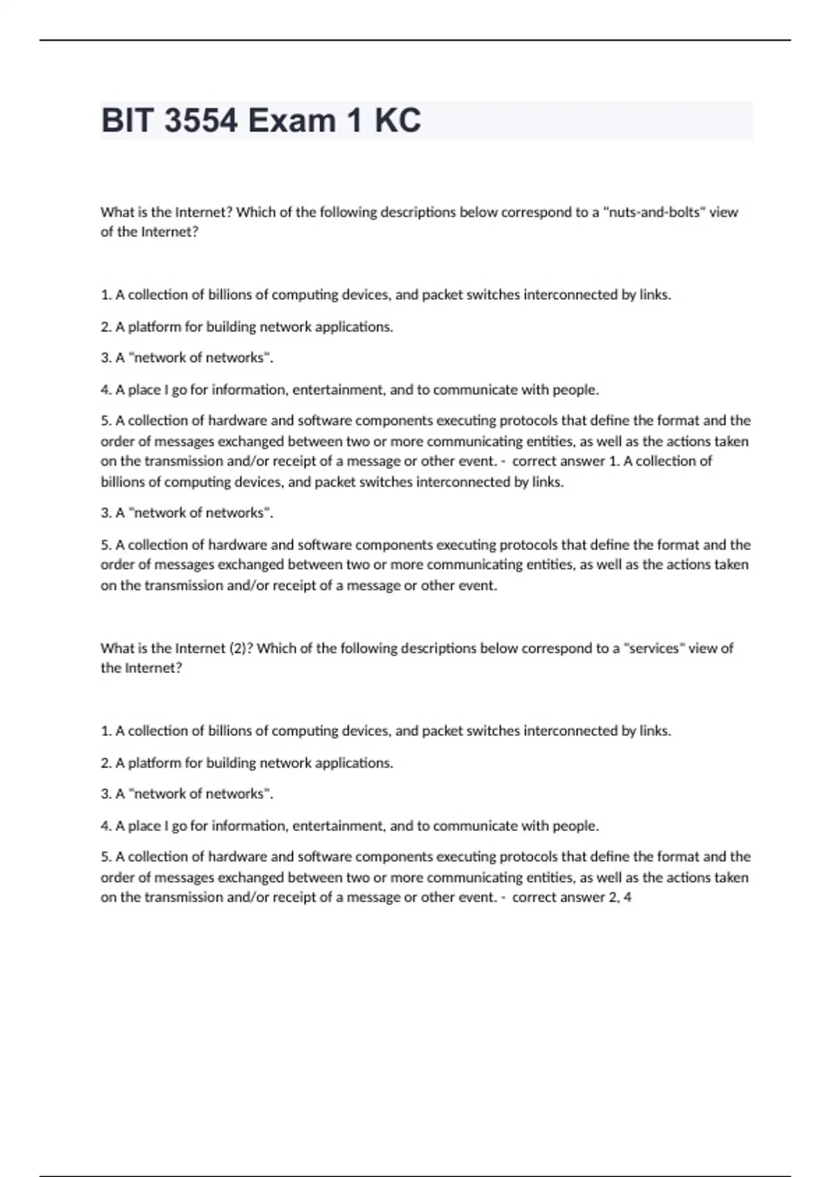 BIT 3554 Exam 1 KCWhat is the Internet? Which of the following descriptions below correspond to a "nuts-and-bolts" view of the Internet? 1. A collection of billions of computing devices, and packet switches interconnected by links. 2. A platform for building network applications. 3. A "network of networks". 4. A place I go for information, entertainment, and to communicate with people. 5. A collection of hardware and software components executing protocols that define the format and the order of messages exchanged between two or more communicating entities, as well as the actions taken on the transmission and/or receipt of a message or other event. - correct answer 1. A collection of billions of computing devices, and packet switches interconnected by links. 3. A "network of networks". 5. A collection of hardware and software components executing protocols that define the format and the order of messages exchanged between two or more communicating entities, as well as the actions taken on the transmission and/or receipt of a message or other event. What is the Internet (2)? Which of the following descriptions below correspond to a "services" view of the Internet? 1. A collection of billions of computing devices, and packet switches interconnected by links. 2. A platform for building network applications. 3. A "network of networks". 4. A place I go for information, entertainment, and to communicate with people. 5. A collection of hardware and software components executing protocols that define the format and the order of messages exchanged between two or more communicating entities, as well as the actions taken on the transmission and/or receipt of a message or other event. - correct answer 2, 4