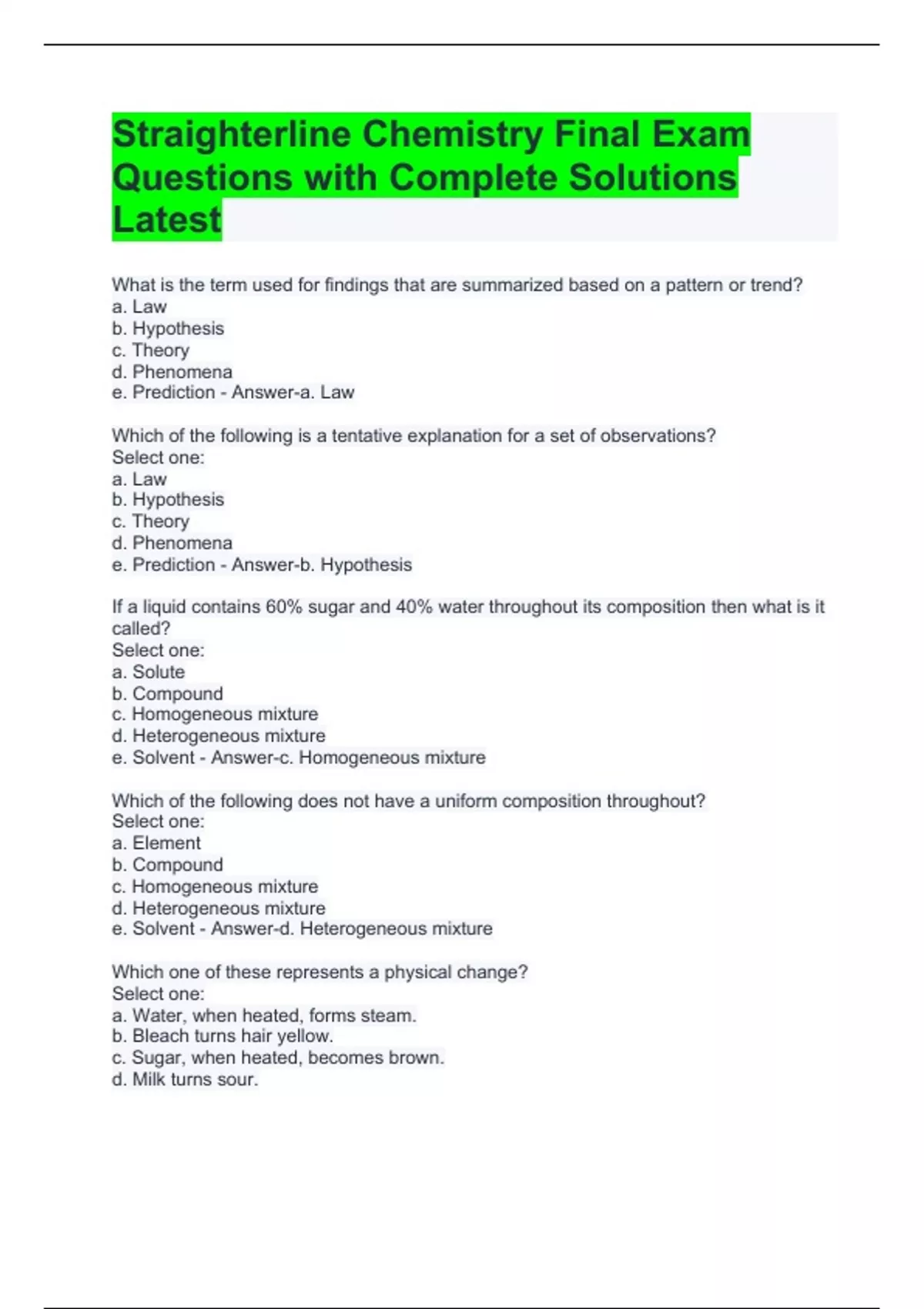 Straighterline Chemistry Final Exam Questions with Complete Solutions Latest