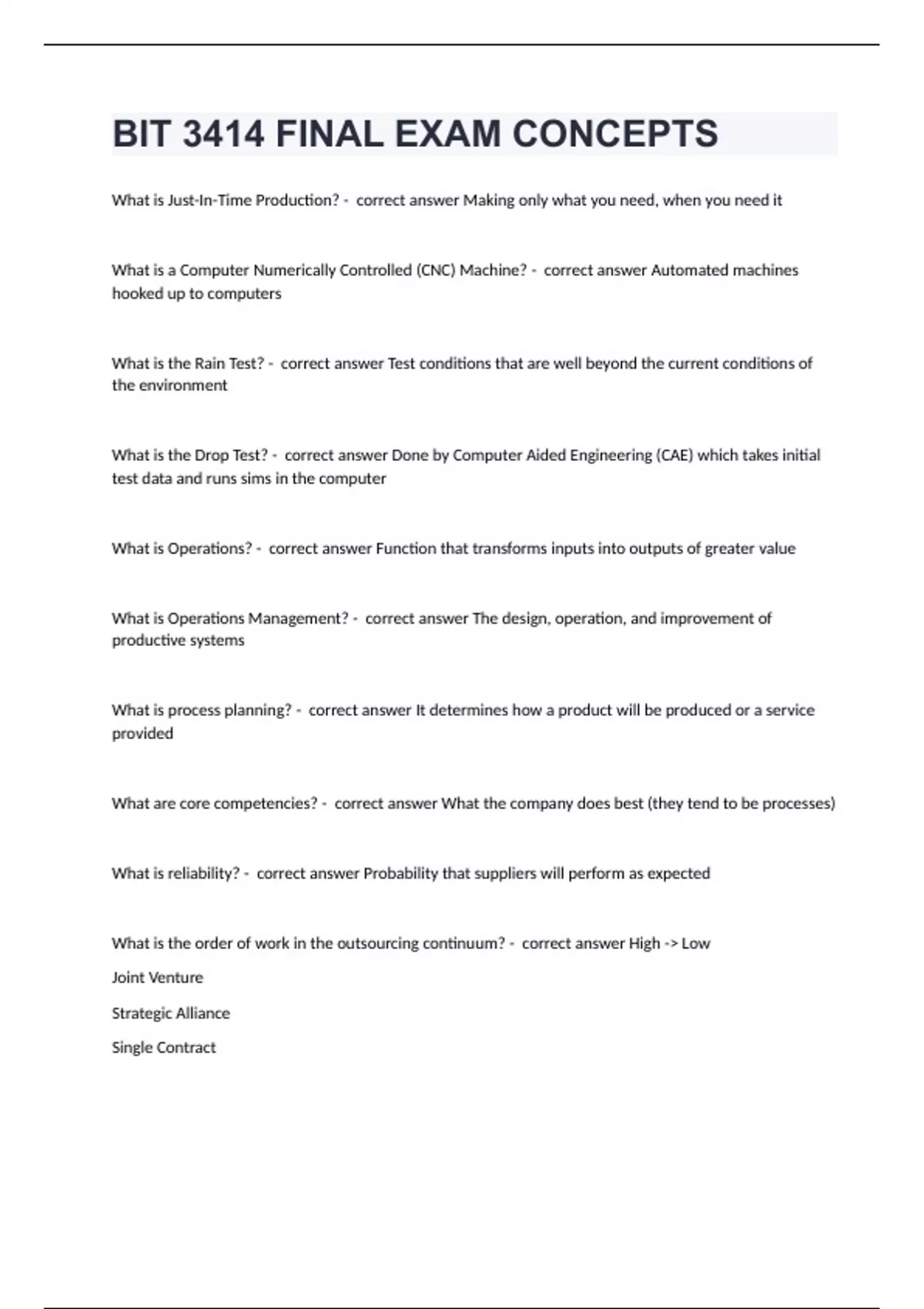 BIT 3414 FINAL EXAM CONCEPTSWhat is Just-In-Time Production? - correct answer Making only what you need, when you need it What is a Computer Numerically Controlled (CNC) Machine? - correct answer Automated machines hooked up to computers What is the Rain Test? - correct answer Test conditions that are well beyond the current conditions of the environment What is the Drop Test? - correct answer Done by Computer Aided Engineering (CAE) which takes initial test data and runs sims in the computer What is Operations? - correct answer Function that transforms inputs into outputs of greater value What is Operations Management? - correct answer The design, operation, and improvement of productive systems What is process planning? - correct answer It determines how a product will be produced or a service provided What are core competencies? - correct answer What the company does best (they tend to be processes) What is reliability? - correct answer Probability that suppliers will perform as expected