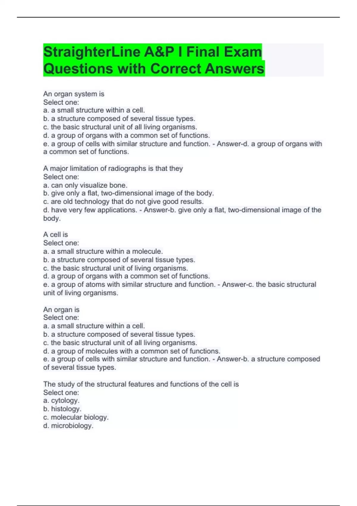 StraighterLine A&P I Final Exam Questions with Correct Answers What technique creates a three-dimensional dynamic image of blood vessels? Select one: a. digital subtraction angiography b. magnetic resonance imaging c. dynamic spatial reconstruction d. positron emission tomography - Answer-a. digital subtraction angiography Which subdivision of anatomy involves the study of organs that function together? Select one: a. regional b. developmental c. systemic d. histology e. surface anatomy - Answer-c. systemic An organelle is Select one: a. a small structure within a cell. b. a structure composed of several tissue types. c. the basic structural unit of all living organisms. d. a group of organs with a common set of functions. e. a group of cells with similar structure and function. - Answer-a. a small structure within a cell. Microscopic examination of a frozen tissue specimen is an application of which of the following disciplines? Select one: a. histology b. physiology c. gross anatomy d. radiology e. regional anatomy - Answer-a. histology Anatomy is Select one: a. the study of function. b. a branch of physiology. c. the study of structure. d. the study of living organisms. e. the study of homeostasis. - Answer-c. the study of structure. A molecular biologist discovers that if a specific drug effectively treats obesity in mice, what can researchers conclude? Select one: a. If the drug was effective in a large number of mice, it will therefore be effective in humans. b. If the drug was effective in a small proportion of mice, it will be effective in a small proportion of humans. c. The mice have provided a positive control in this experiment that proves the drug is effective in humans. d. The drug is effective in the mouse model; it must still be tested in humans. e. The effect of the drug on mice has no bearing on the effect of the drug on humans. - Answer-d. The drug is effective in the mouse model; it must still be tested in humans. While Stacy is in the process of passing over the bar during a pole vault, her hips are considered to be Select one: a. anterior to her shoulders. b. posterior to her shoulders. c. inferior to her shoulders. d. superior to her shoulders. e. cephalic to her shoulders. - Answer-c. inferior to her shoulders.
