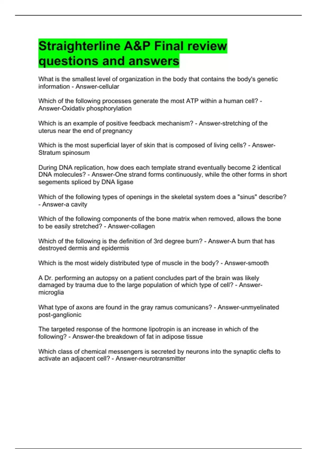 Straighterline A&P Final review questions and answers During DNA replication, how does each template strand eventually become 2 identical DNA molecules? - Answer-One strand forms continuously, while the other forms in short segements spliced by DNA ligase Which of the following types of openings in the skeletal system does a "sinus" describe? - Answer-a cavity Which of the following components of the bone matrix when removed, allows the bone to be easily stretched? - Answer-collagen Which of the following is the definition of 3rd degree burn? - Answer-A burn that has destroyed dermis and epidermis Which is the most widely distributed type of muscle in the body? - Answer-smooth A Dr. performing an autopsy on a patient concludes part of the brain was likely damaged by trauma due to the large population of which type of cell? - Answer-microglia What type of axons are found in the gray ramus comunicans? - Answer-unmyelinated post-ganglionic The targeted response of the hormone lipotropin is an increase in which of the following? - Answer-the breakdown of fat in adipose tissue Which class of chemical messengers is secreted by neurons into the synaptic clefts to activate an adjacent cell? - Answer-neurotransmitter