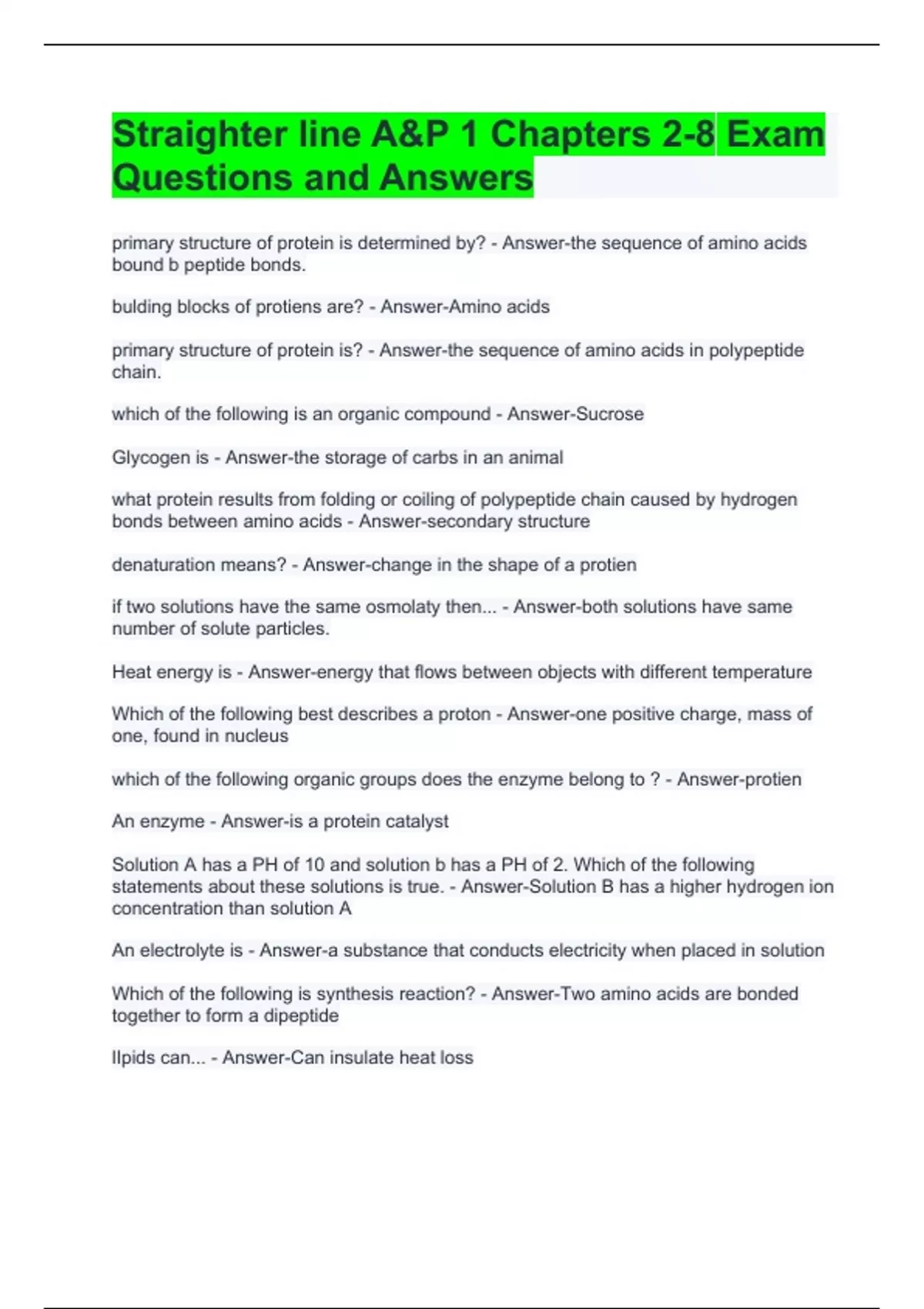 Straighter line A&P 1 Chapters 2-8 Exam Questions and Answers what protein results from folding or coiling of polypeptide chain caused by hydrogen bonds between amino acids - Answer-secondary structure denaturation means? - Answer-change in the shape of a protien if two solutions have the same osmolaty then... - Answer-both solutions have same number of solute particles. Heat energy is - Answer-energy that flows between objects with different temperature Which of the following best describes a proton - Answer-one positive charge, mass of one, found in nucleus which of the following organic groups does the enzyme belong to ? - Answer-protien An enzyme - Answer-is a protein catalyst Solution A has a PH of 10 and solution b has a PH of 2. Which of the following statements about these solutions is true. - Answer-Solution B has a higher hydrogen ion concentration than solution A
